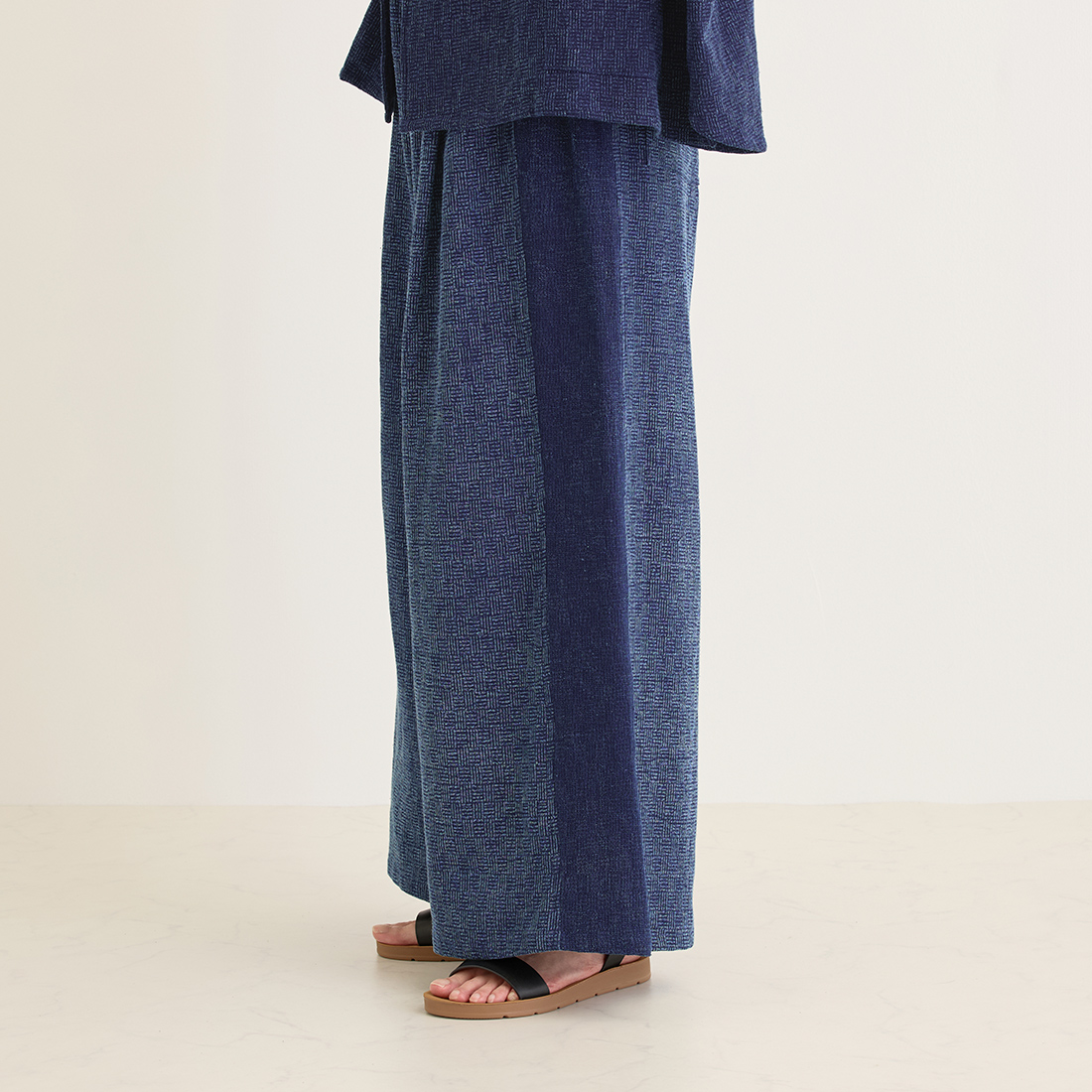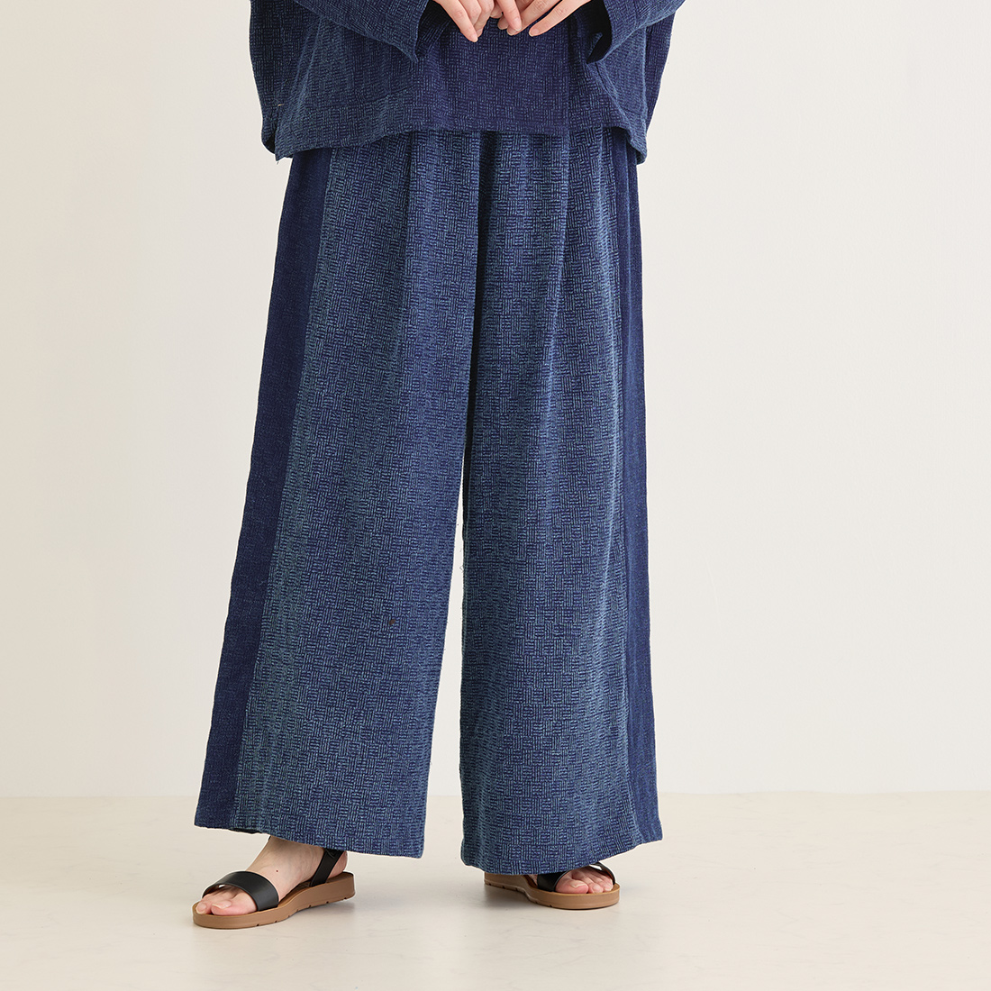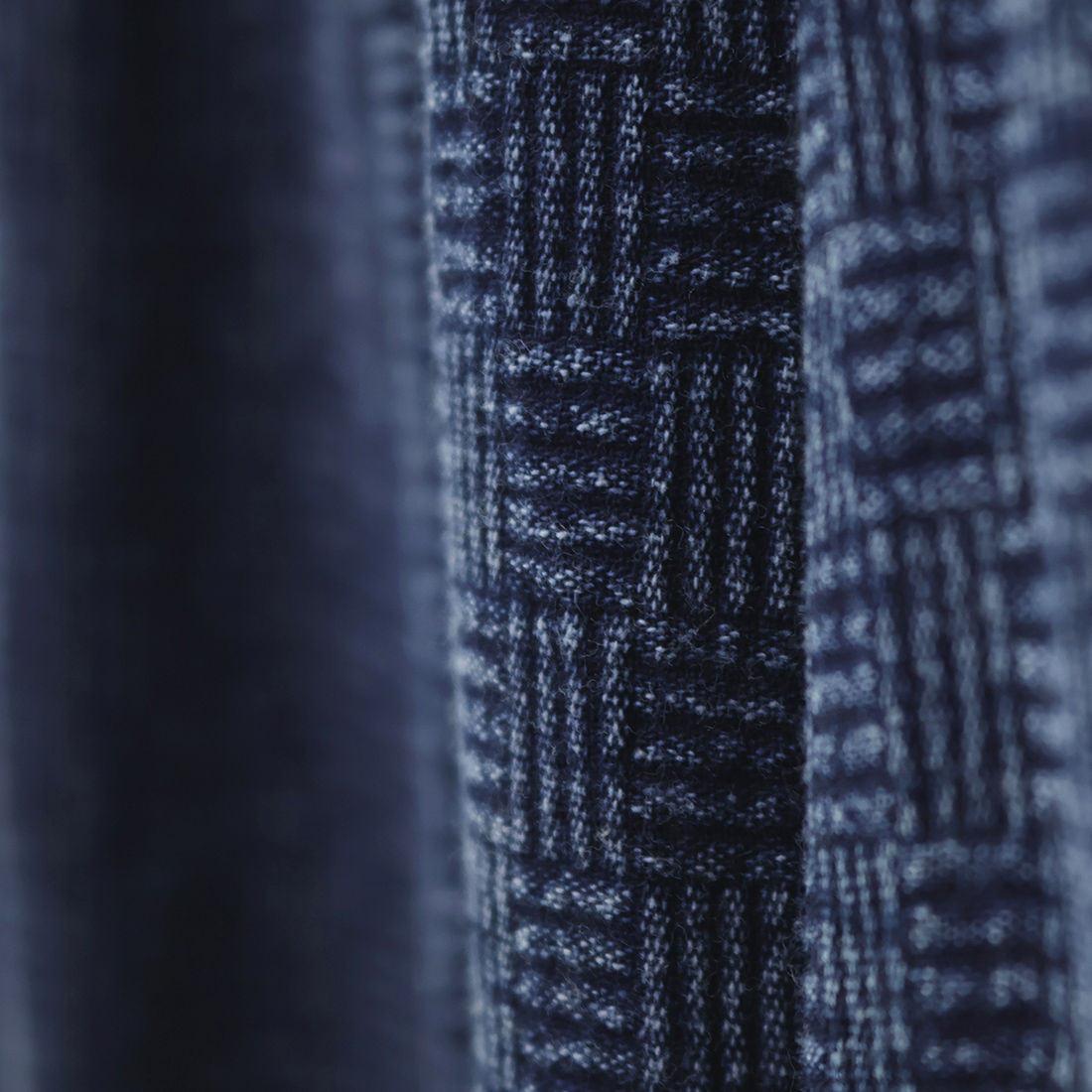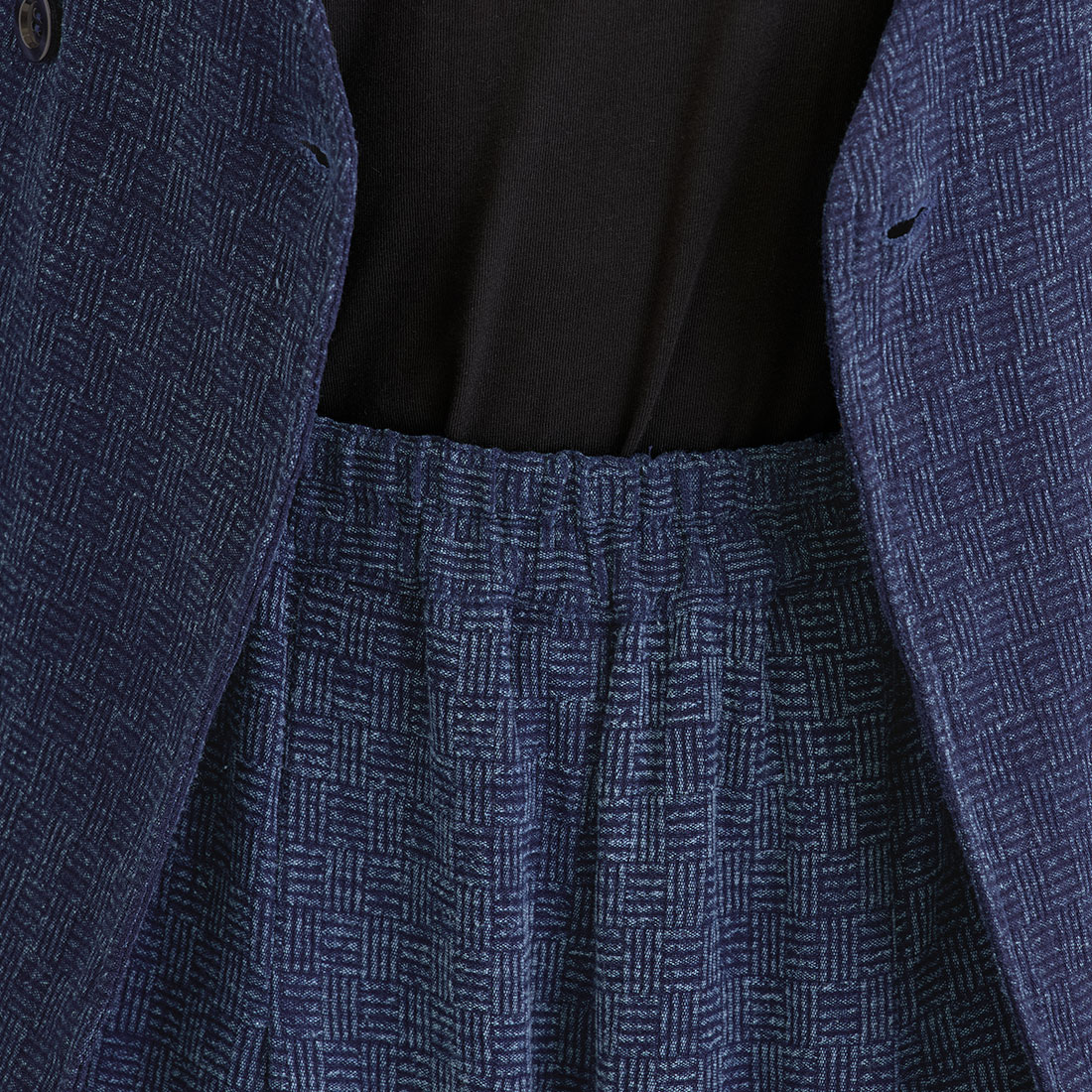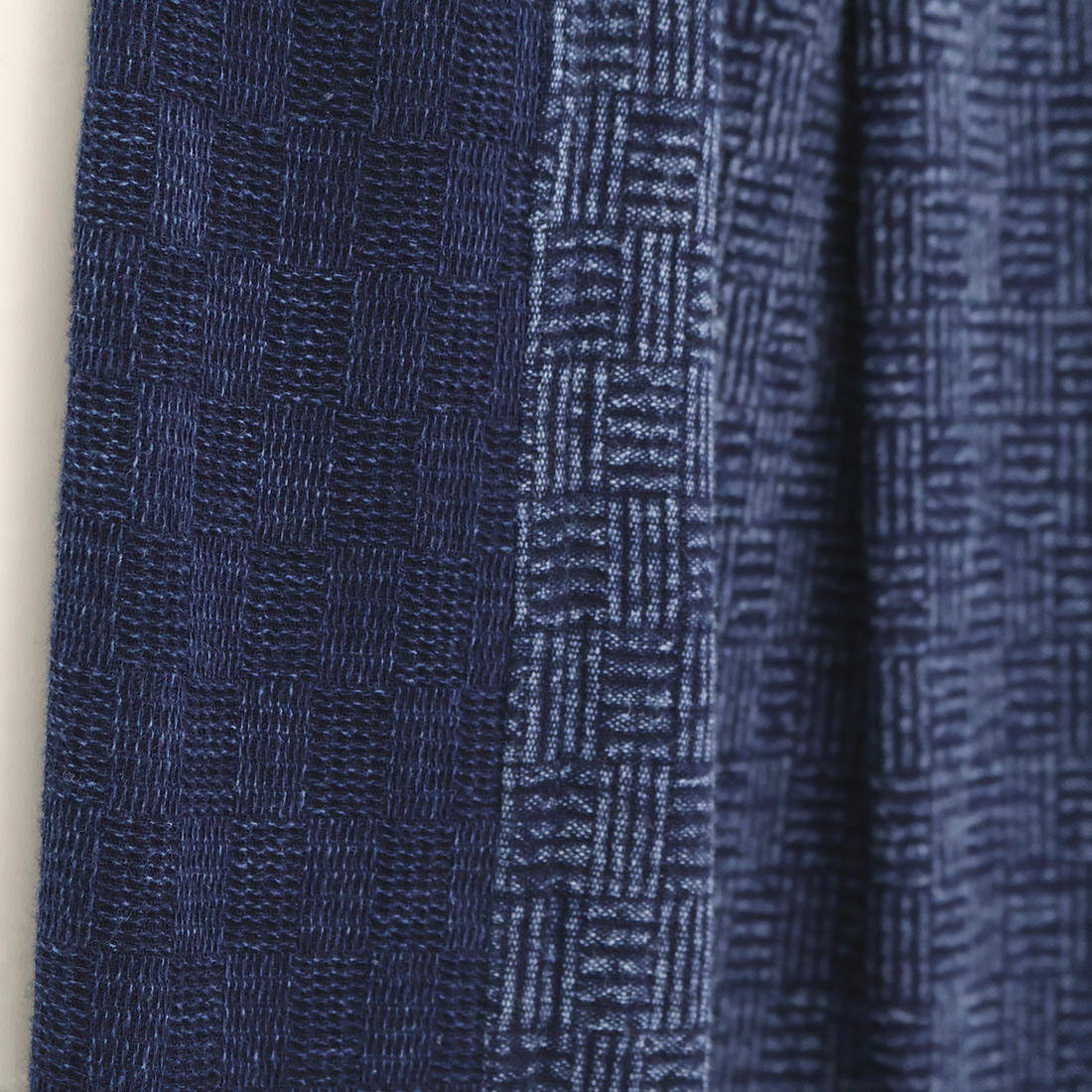 格子状の凹凸ある厚みの生地をインディゴ染めしました。