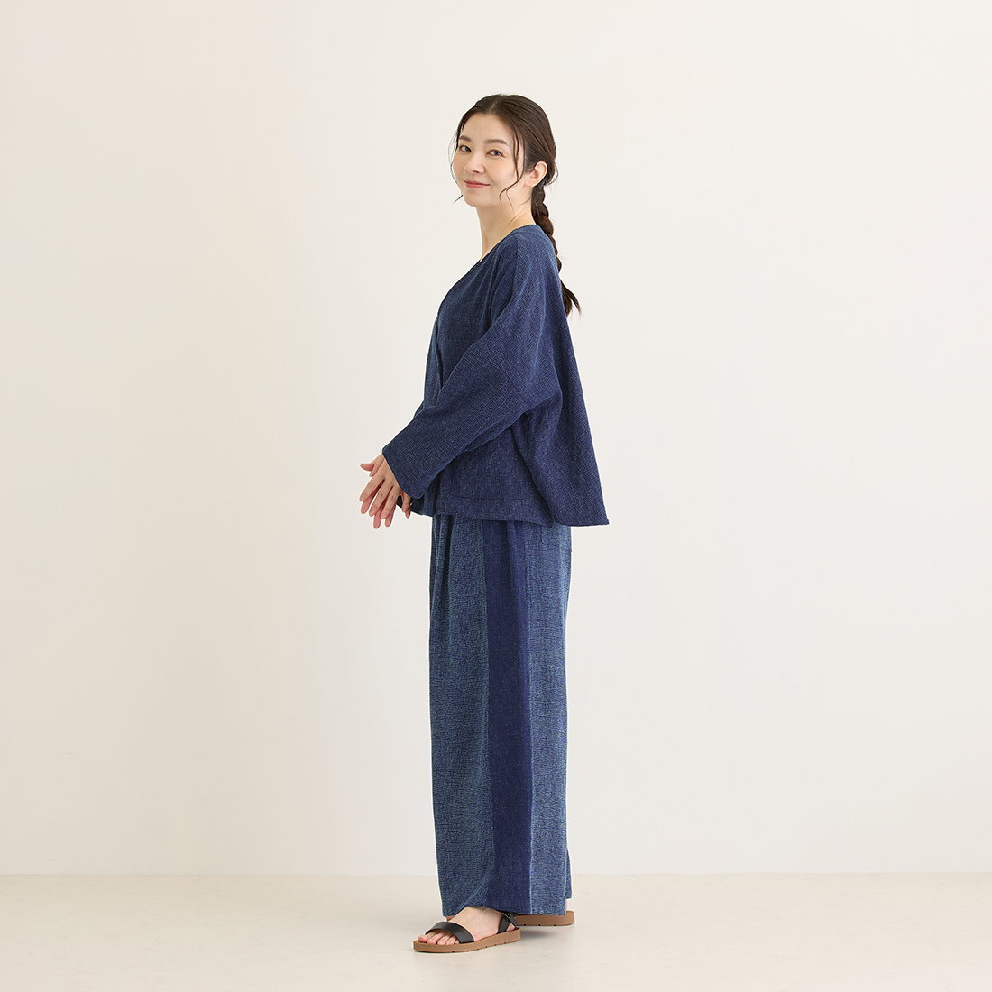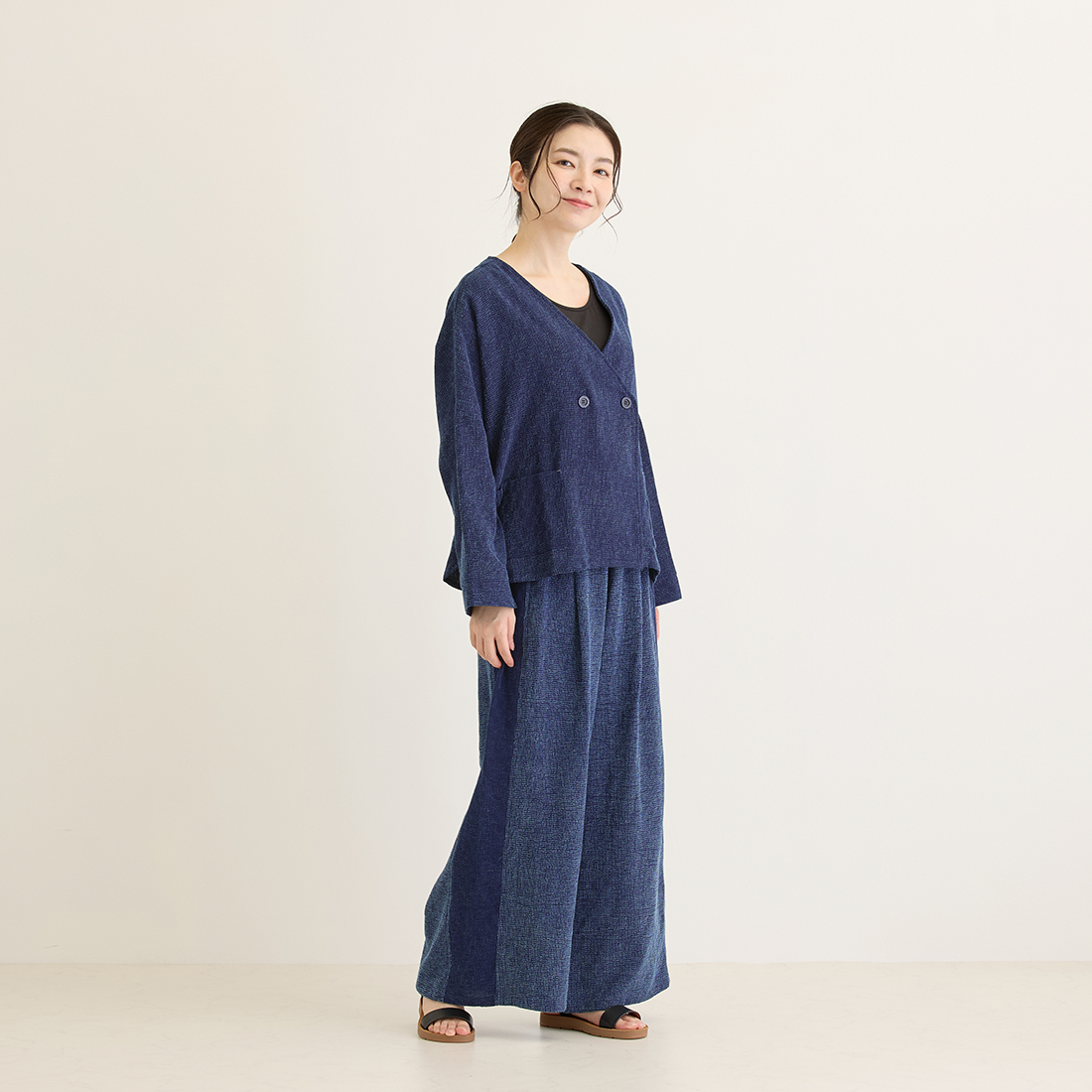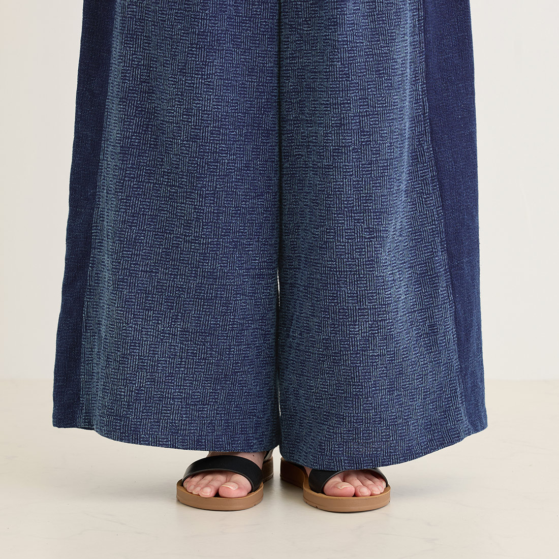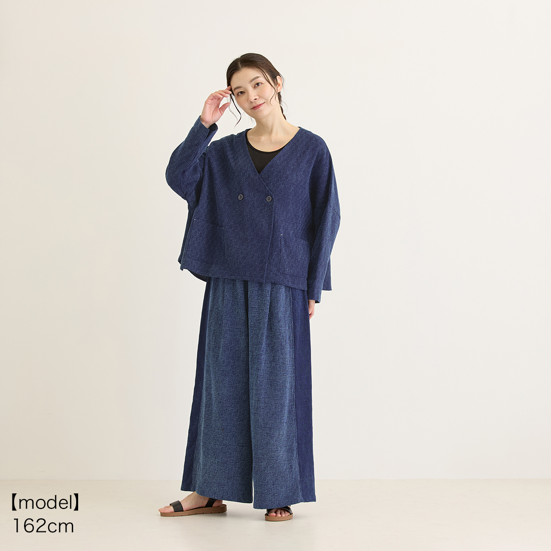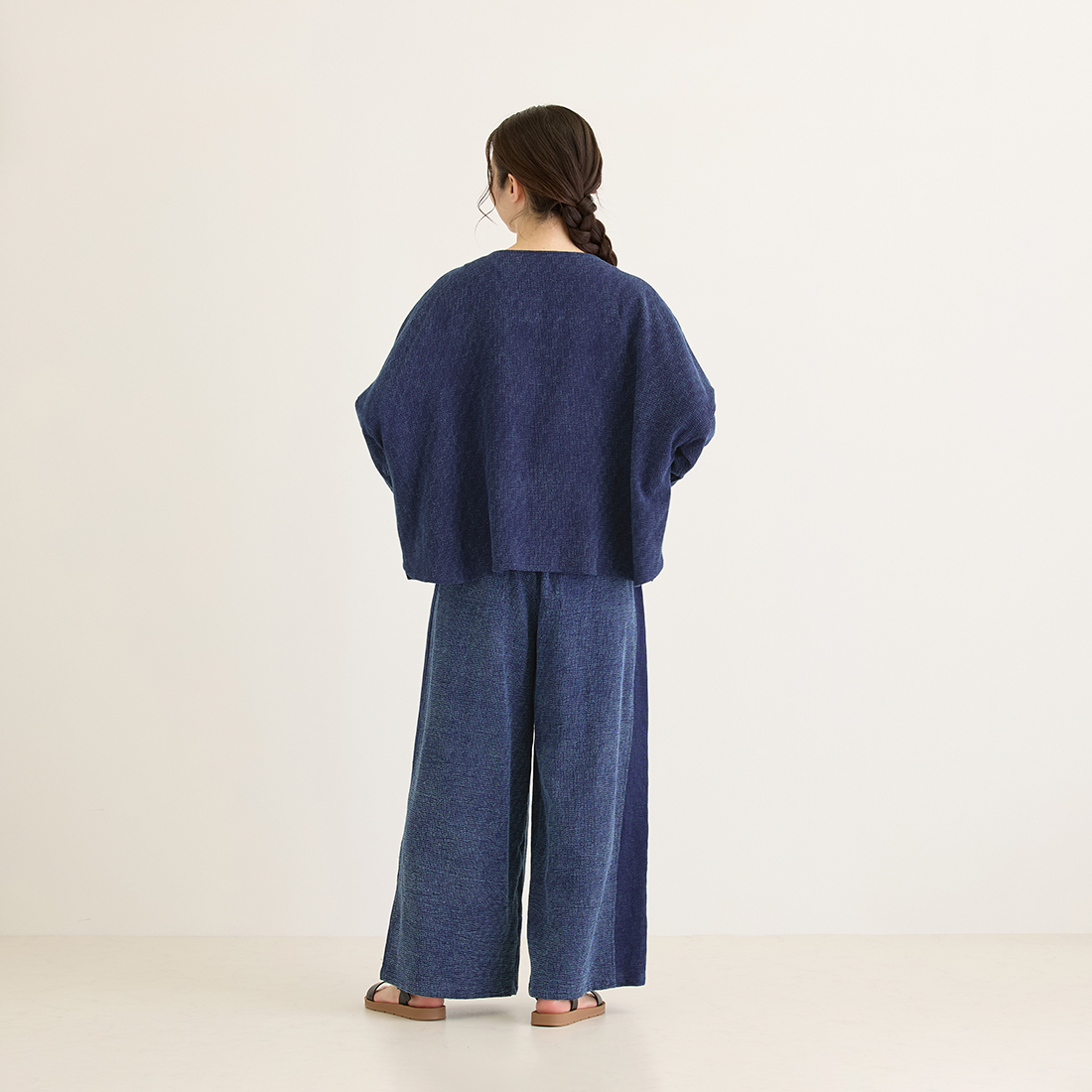 格子状の凹凸ある厚みの生地をインディゴ染めしました。