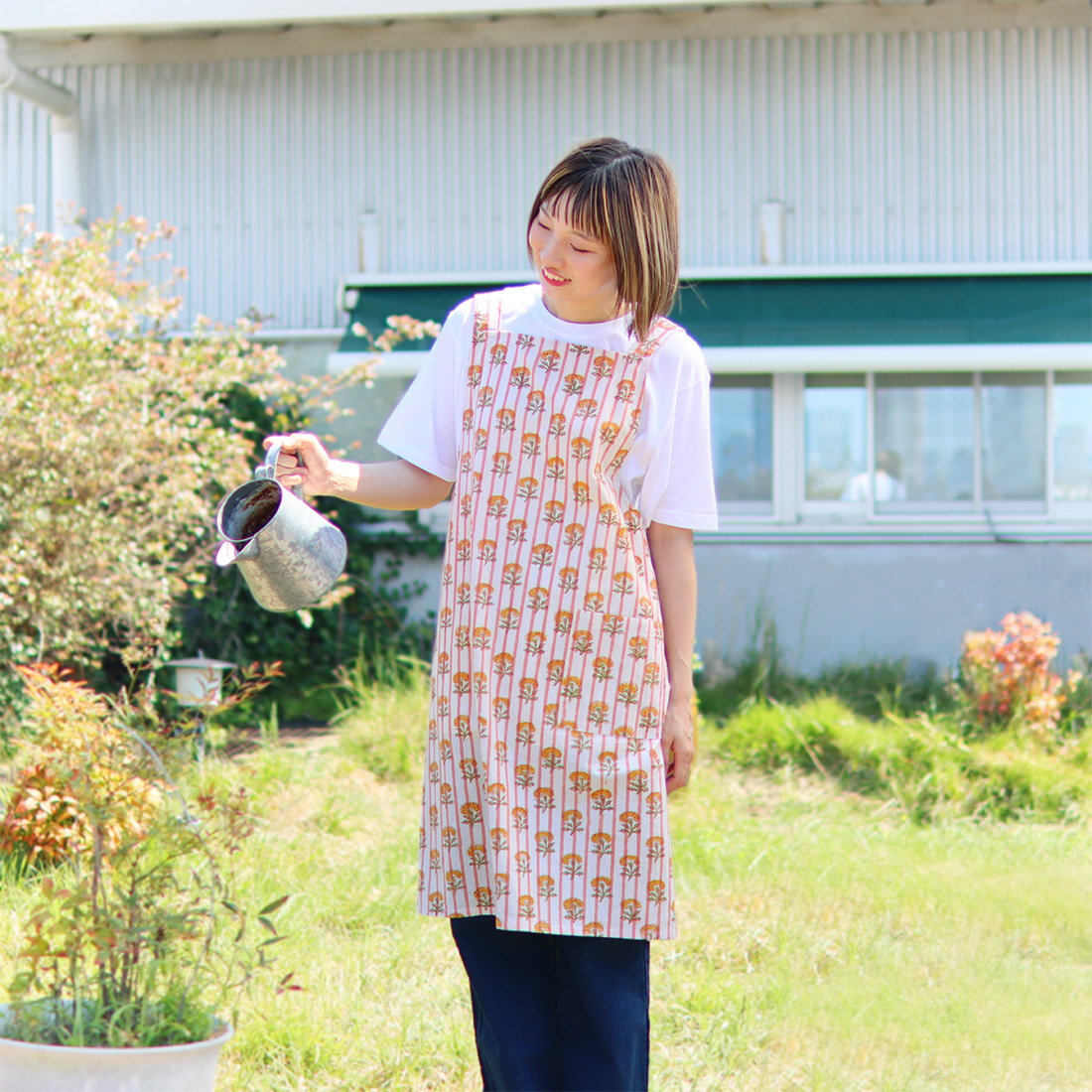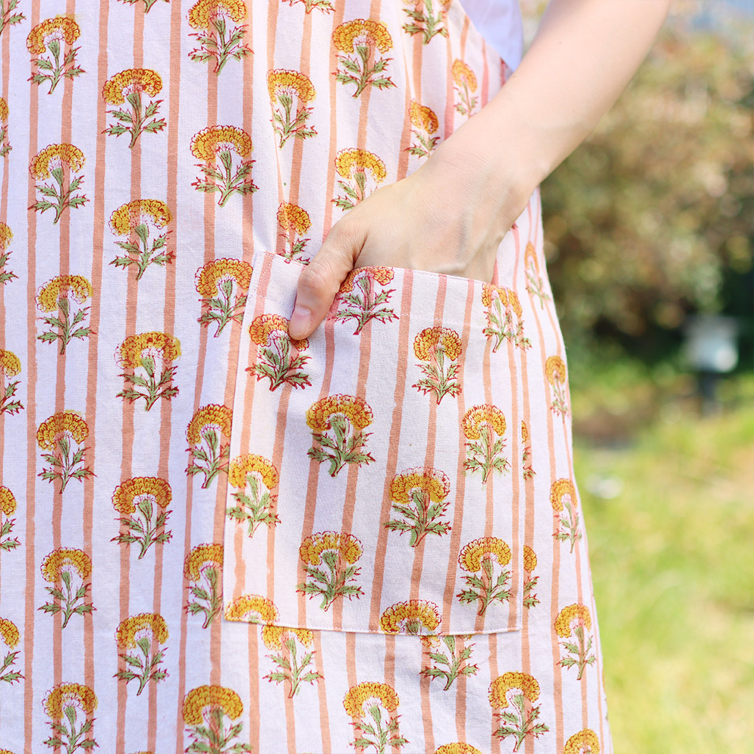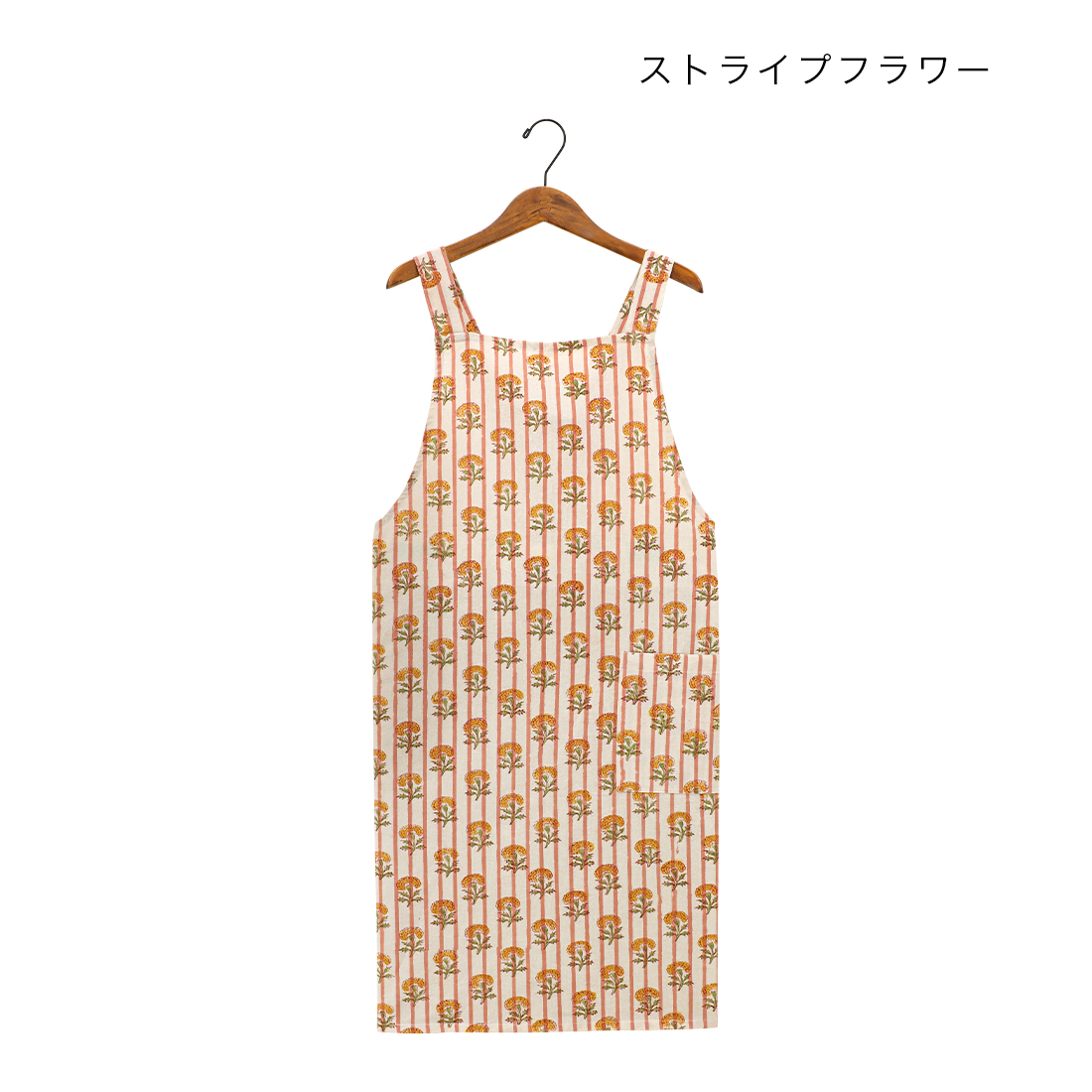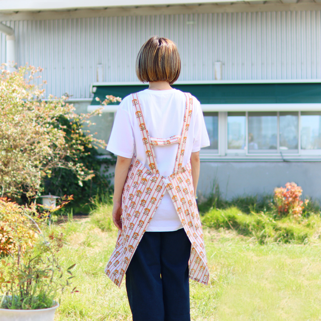 ブロックプリントでデザインされたボタニカルフラワーをあしらったエプロン。