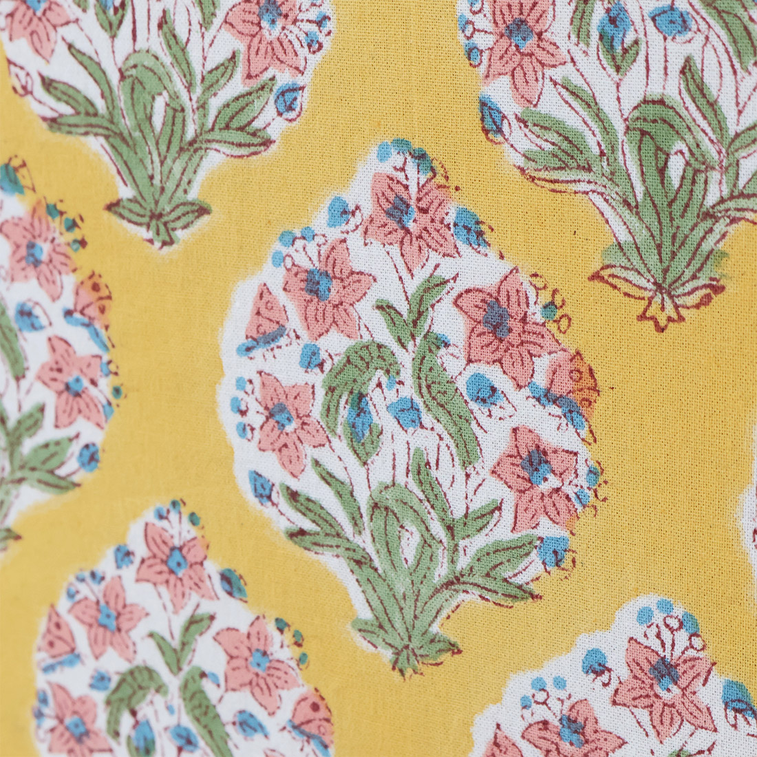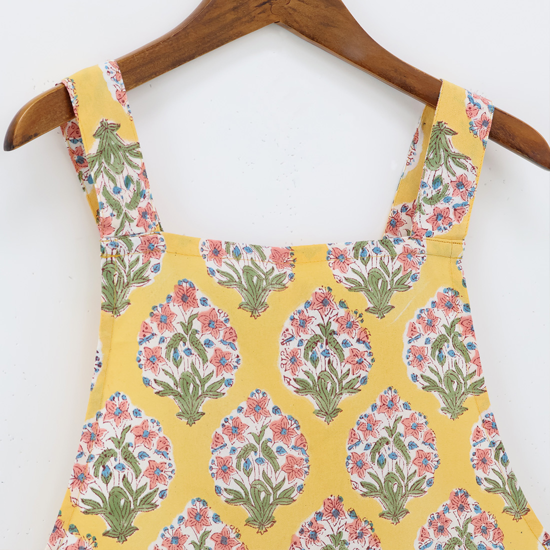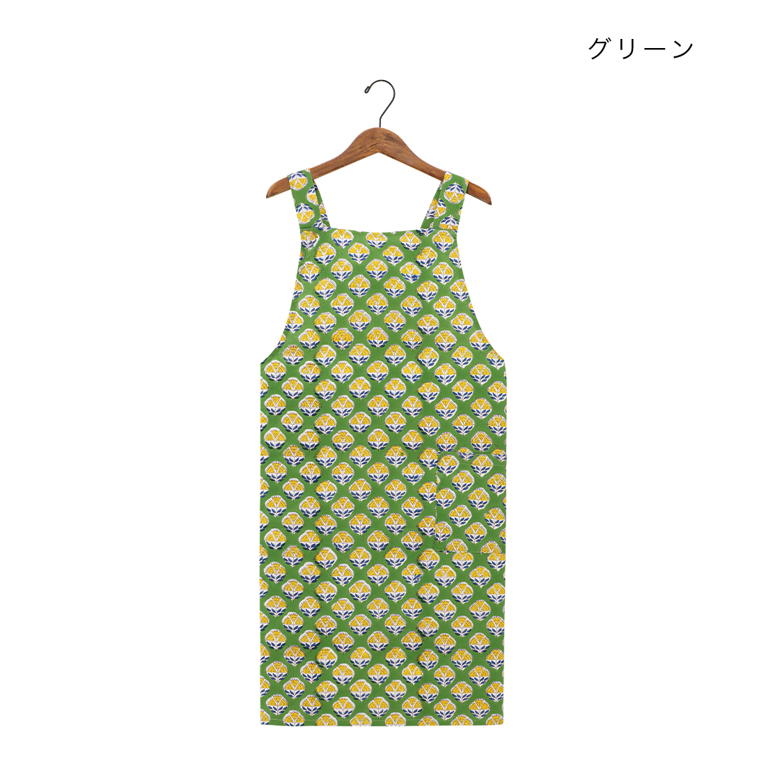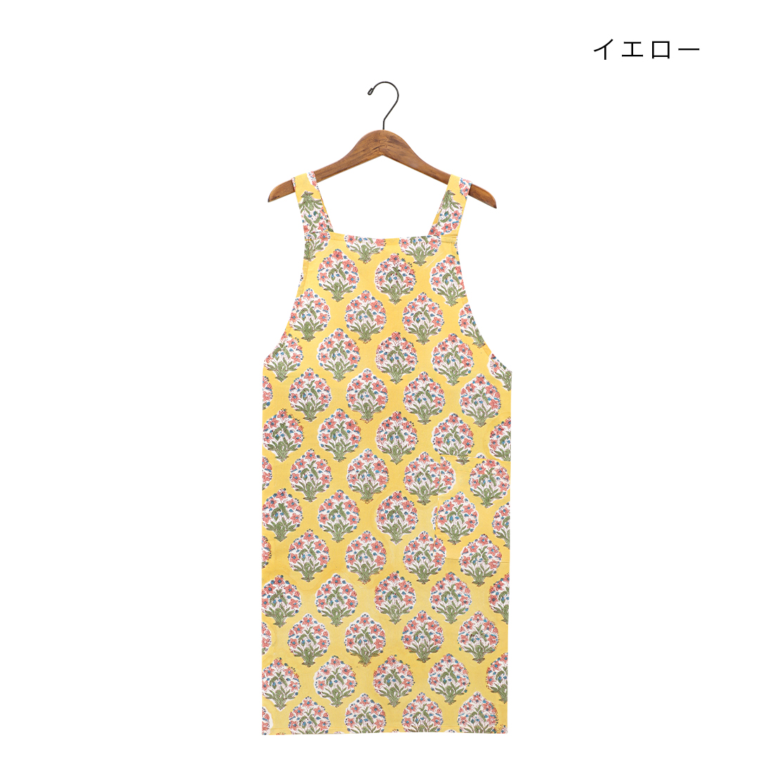 ブロックプリントでデザインされたボタニカルフラワーをあしらったエプロン。