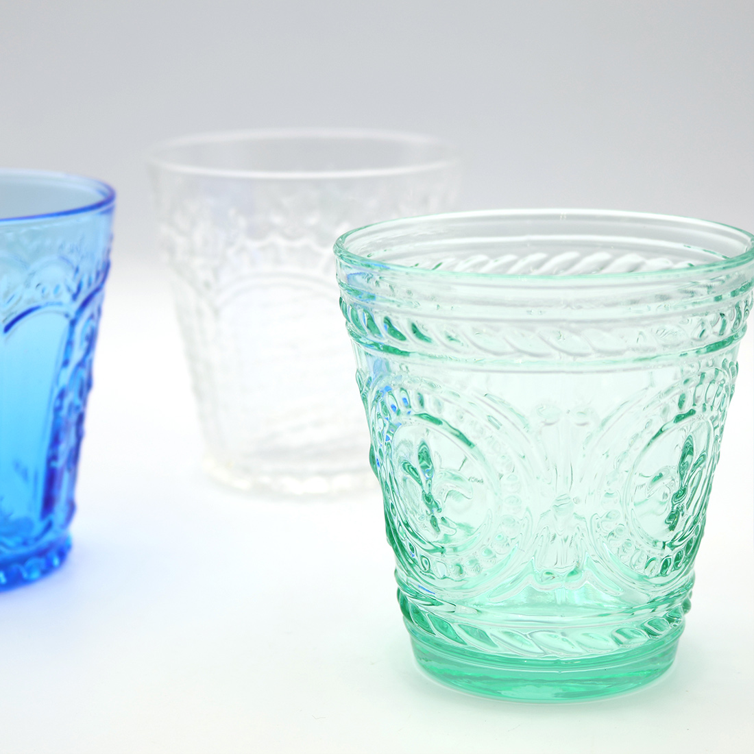 昨年大人気のエンボスグラスに新作が登場。見た目にも涼し気で使いやすい3色を揃えました。テーブルの爽やかな雰囲気に、会話も楽しく弾みそう♪