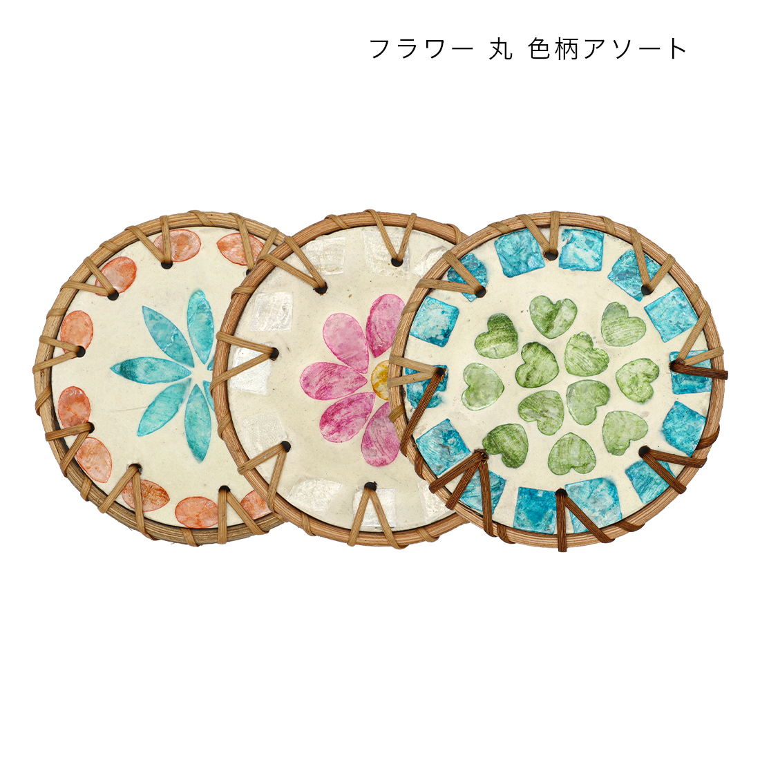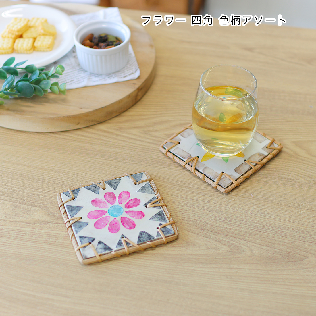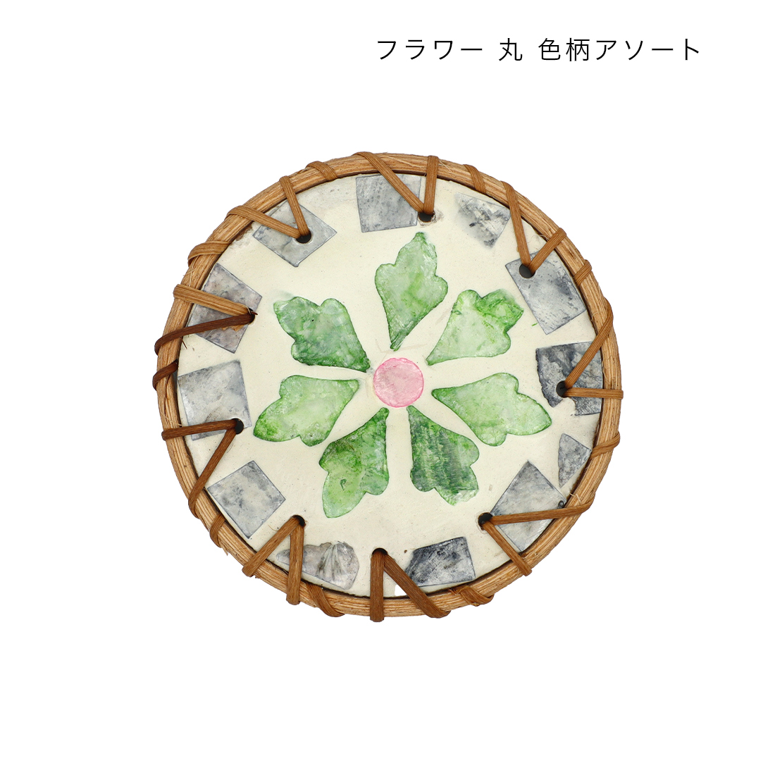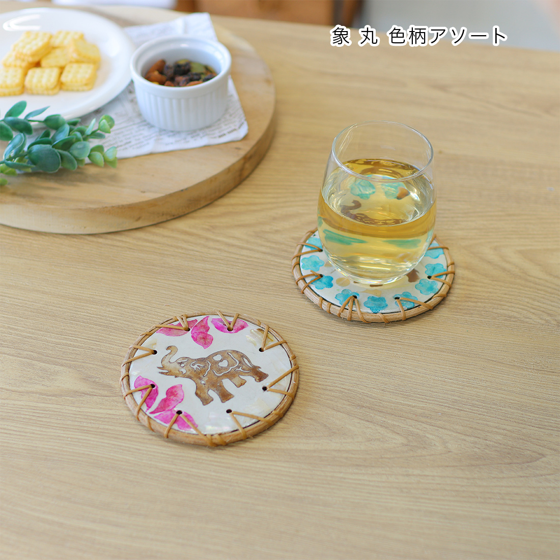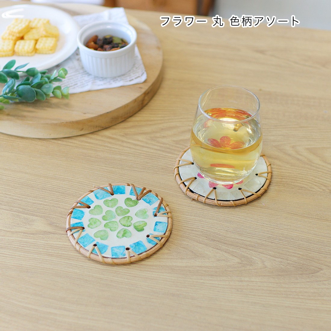 シェルとラタンで出来たコースターです。アソートカラーのカラフルな柄が、食卓をにぎやかにしてくれます。食卓の雰囲気で使い分けられる、丸形と四角形を揃えました。