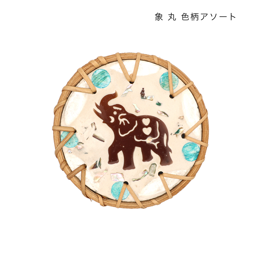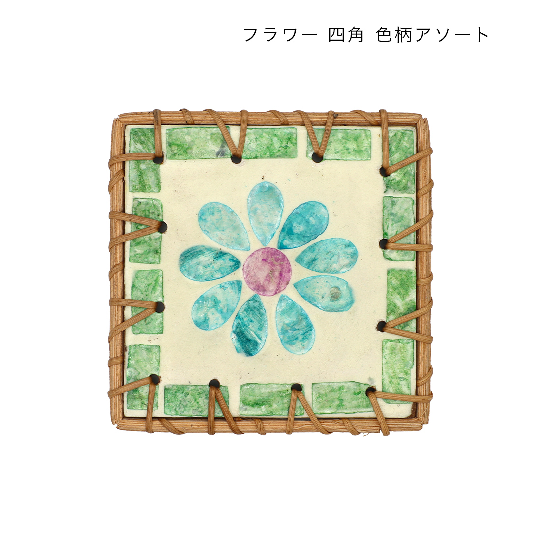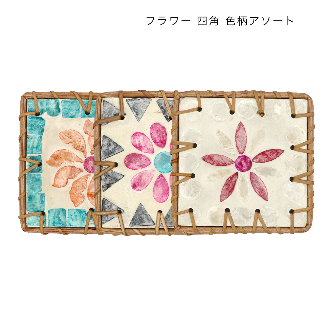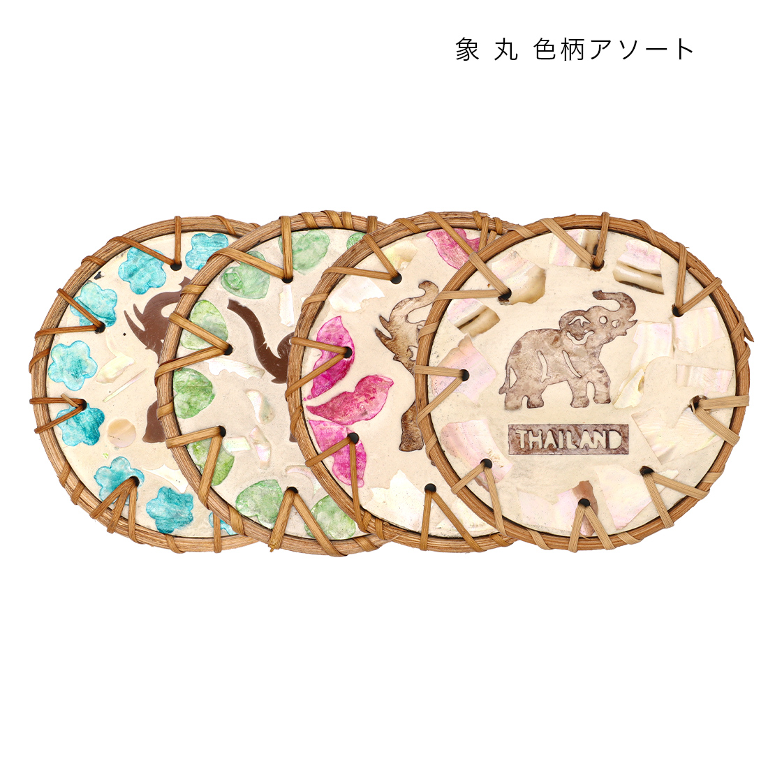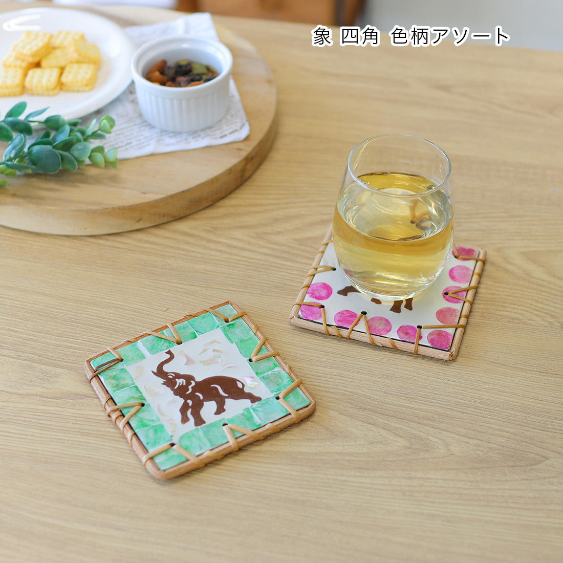シェルとラタンで出来たコースターです。アソートカラーのカラフルな柄が、食卓をにぎやかにしてくれます。食卓の雰囲気で使い分けられる、丸形と四角形を揃えました。
