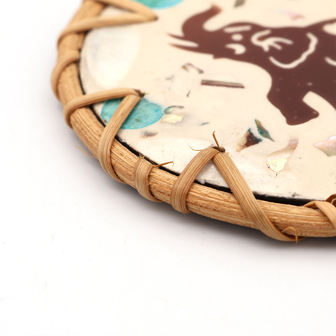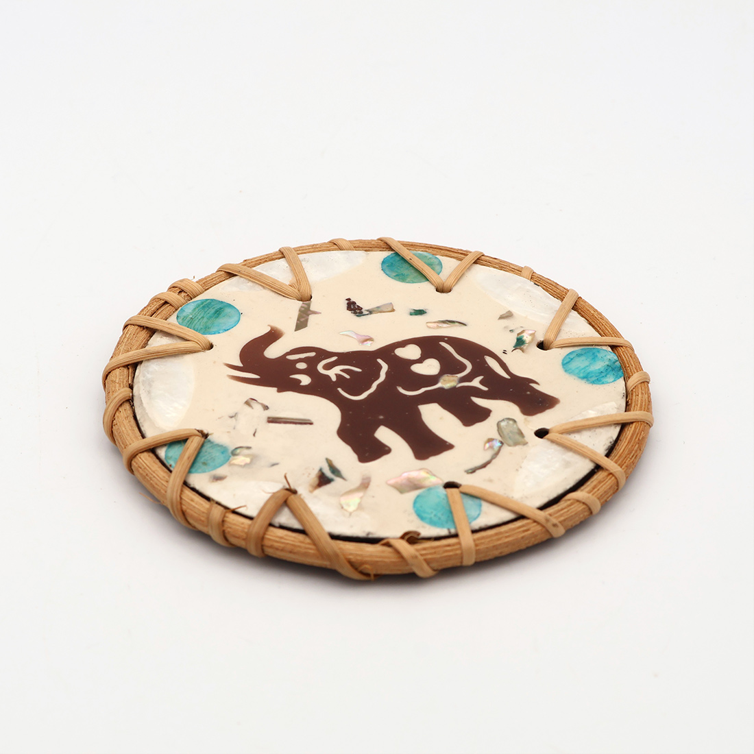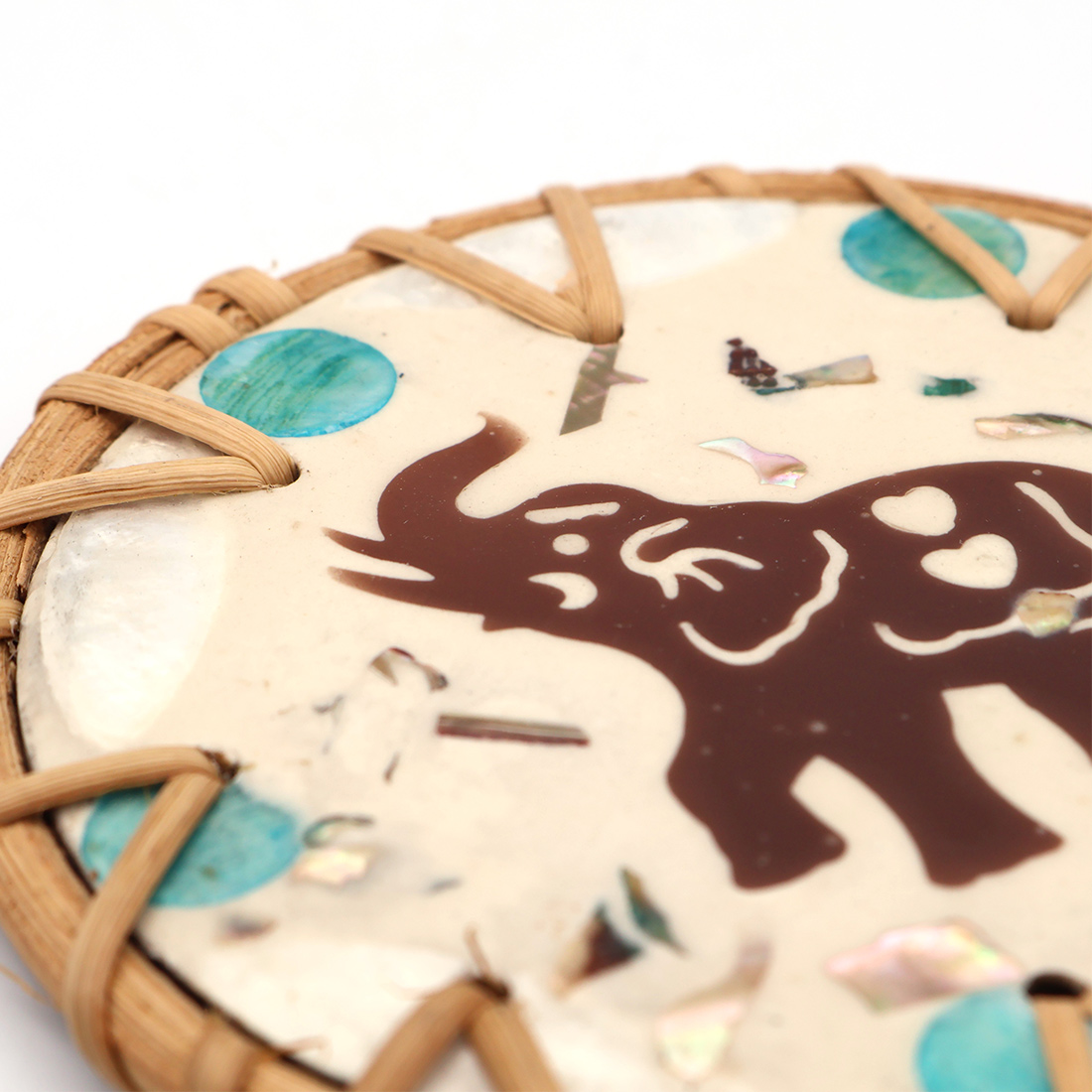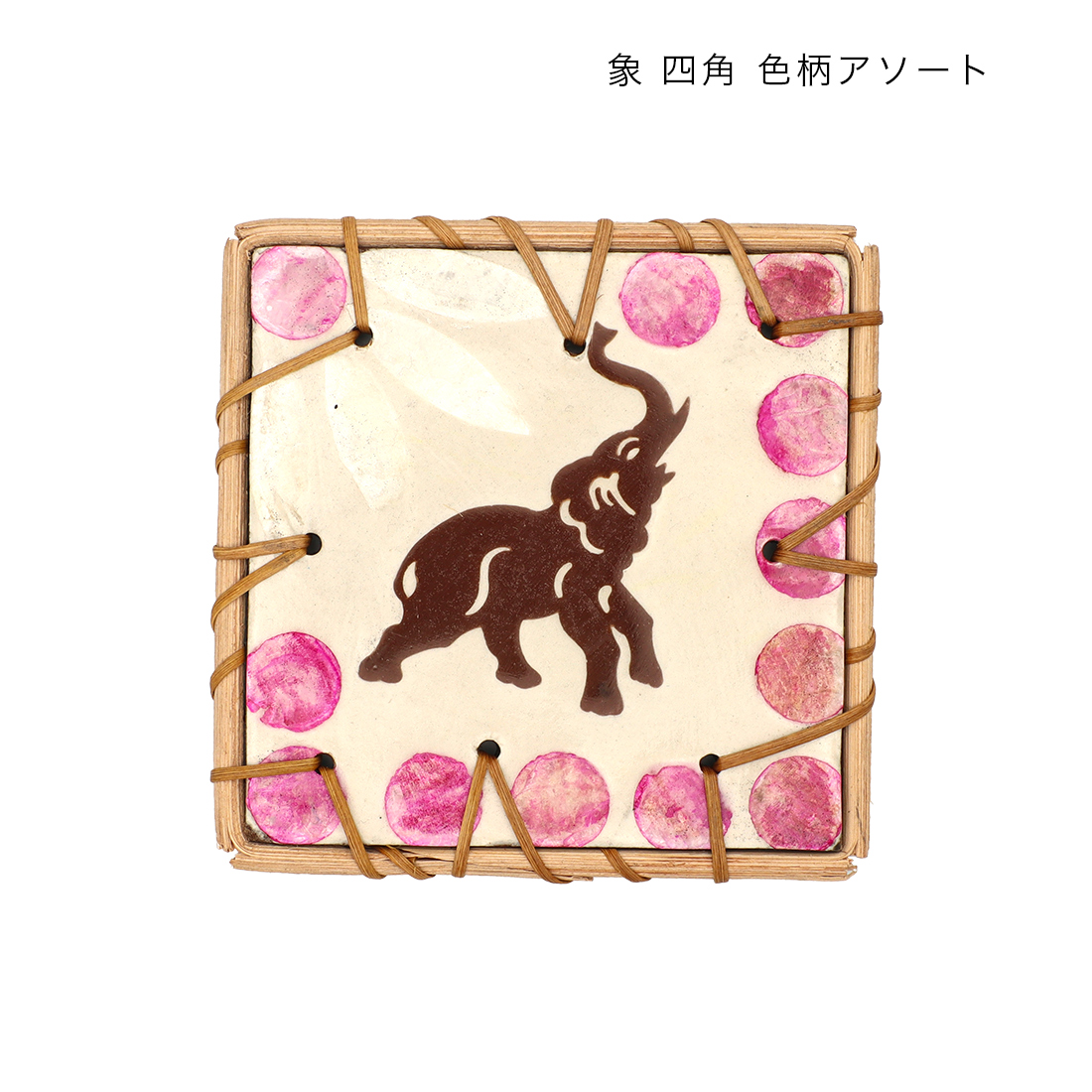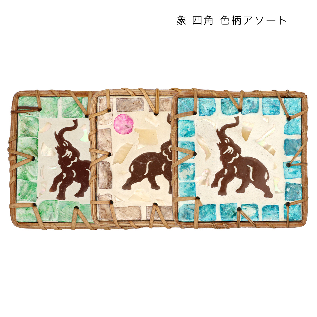 シェルとラタンで出来たコースターです。アソートカラーのカラフルな柄が、食卓をにぎやかにしてくれます。食卓の雰囲気で使い分けられる、丸形と四角形を揃えました。