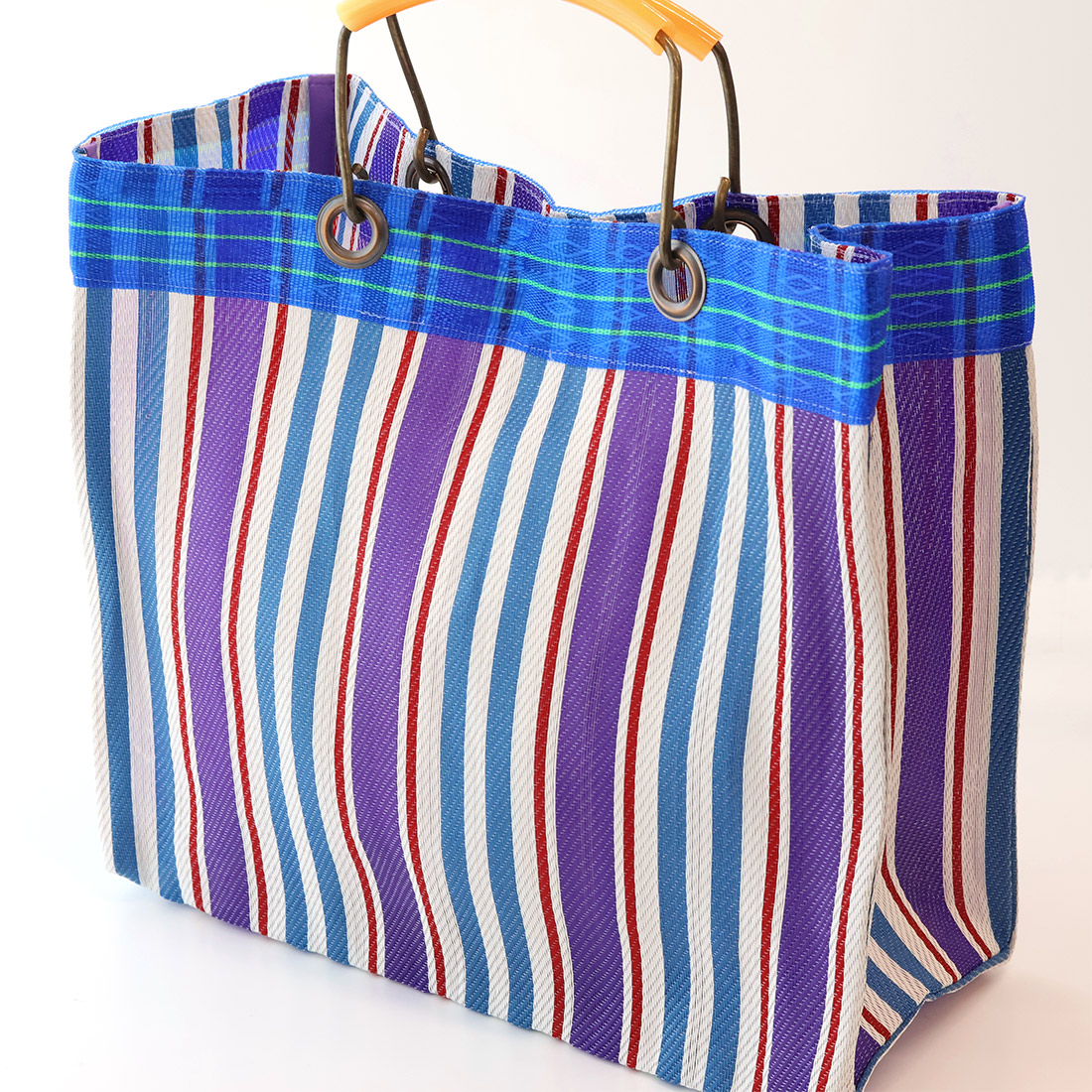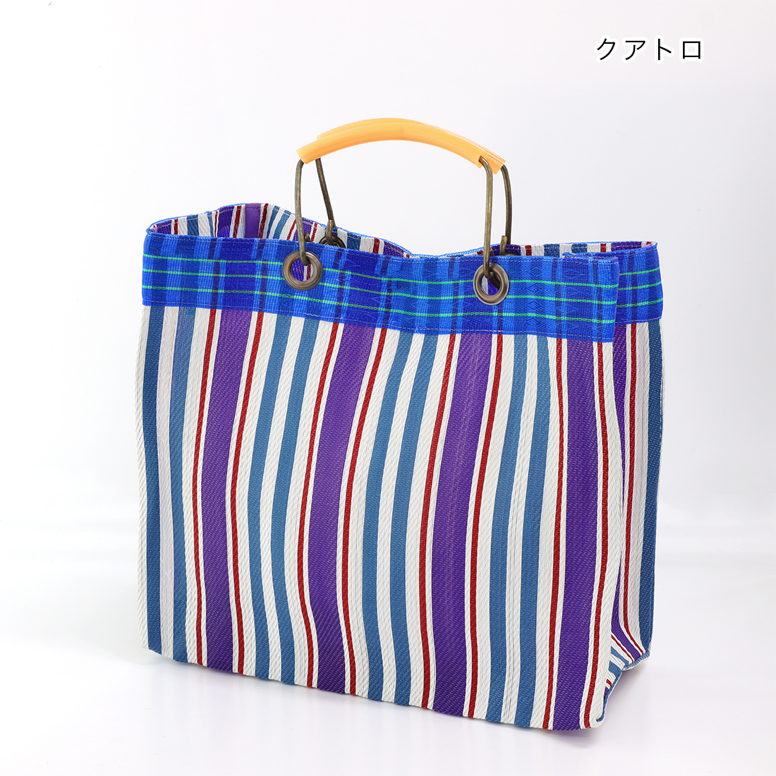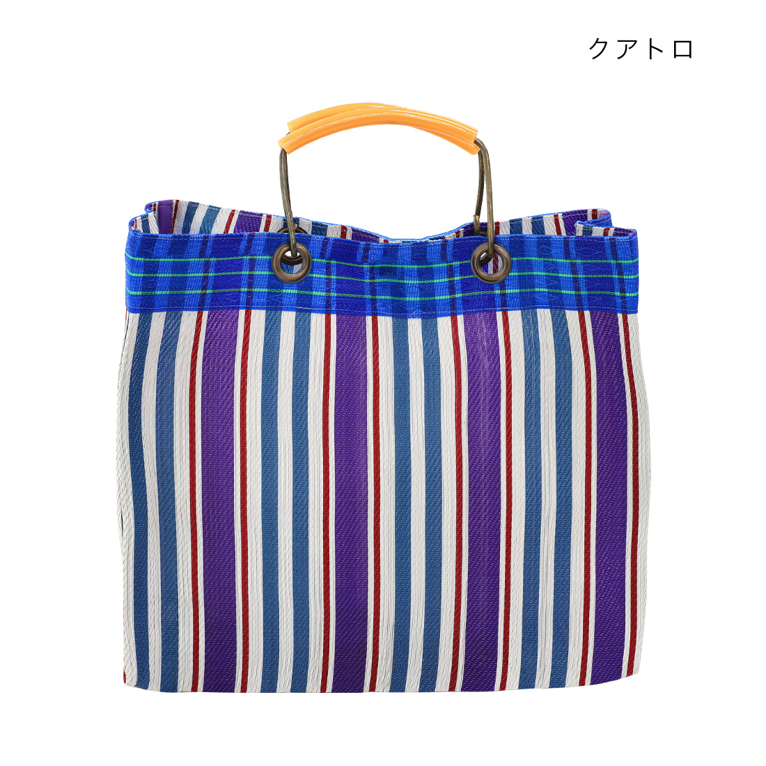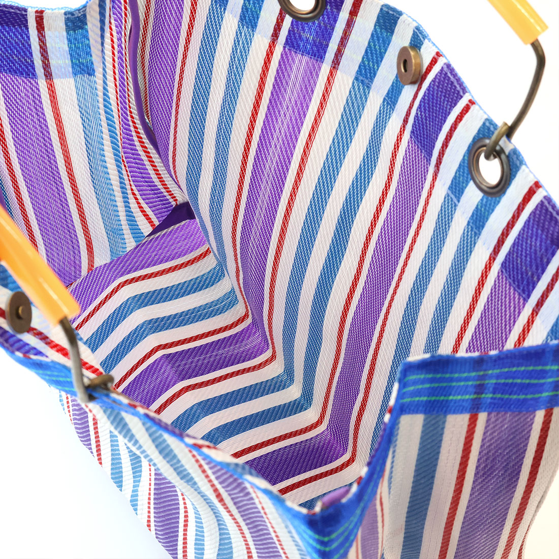 現地のマーケットバッグとして使われる丈夫で水濡れOKのPP素材のストライプバッグ。日常のお買い物バッグやサブバッグとして幅広く使用可能!大容量で見た目以上の収納力があり、レジャー・アウトドア用のバッグとしても〇