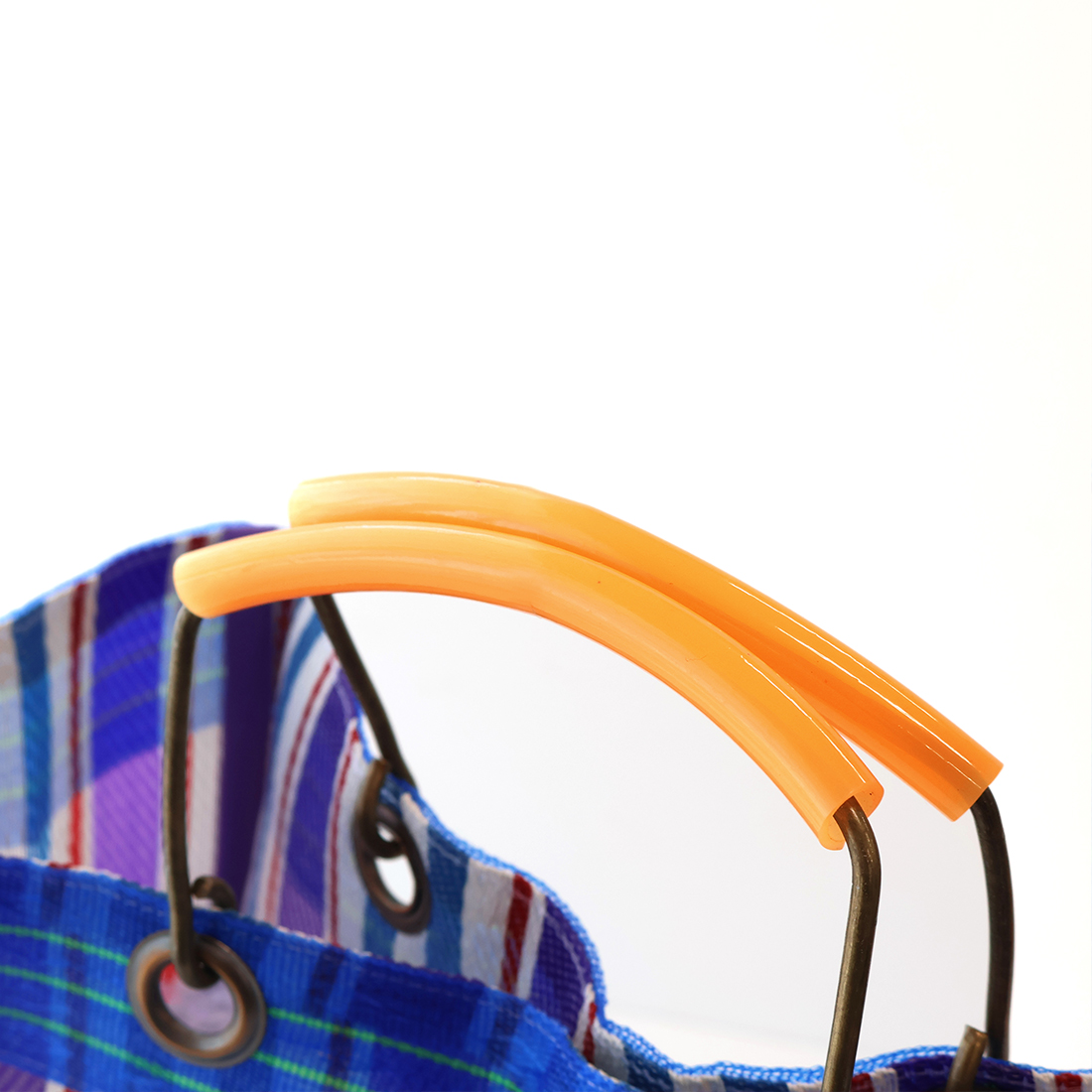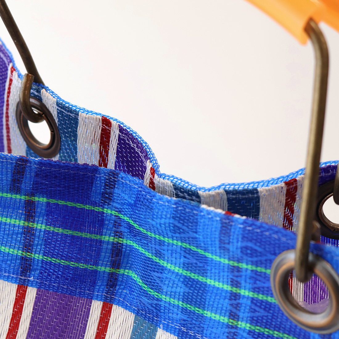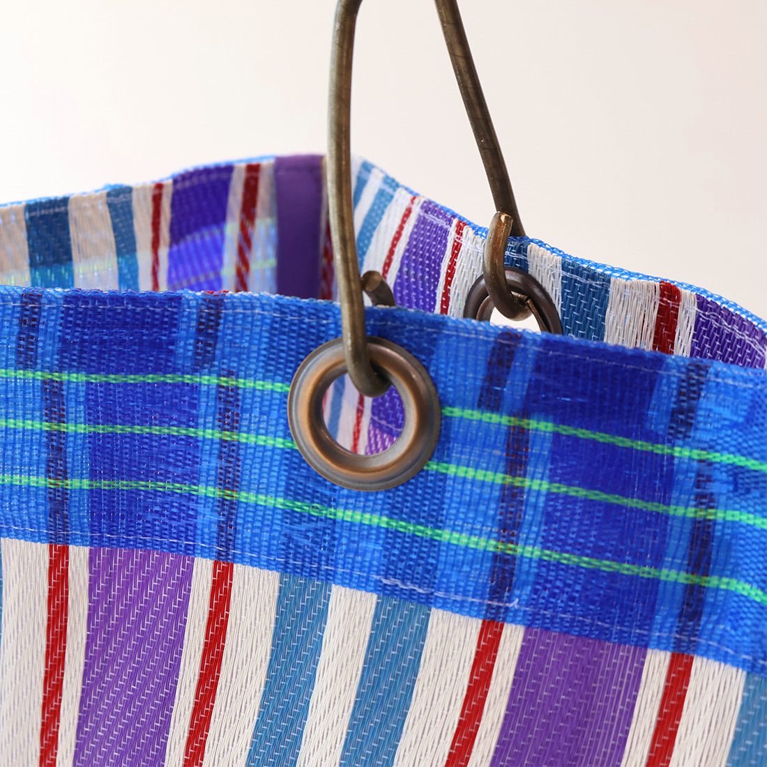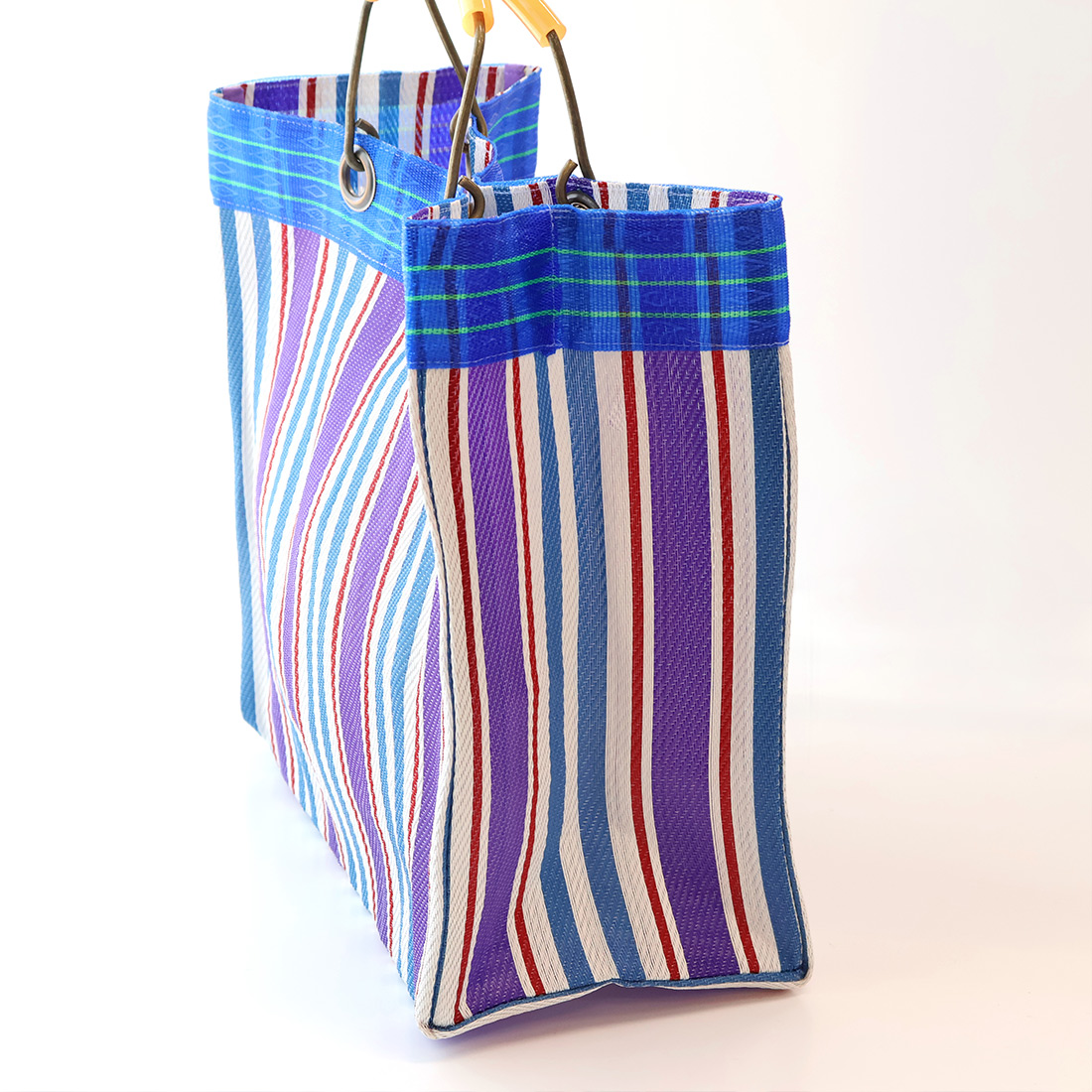 現地のマーケットバッグとして使われる丈夫で水濡れOKのPP素材のストライプバッグ。日常のお買い物バッグやサブバッグとして幅広く使用可能!大容量で見た目以上の収納力があり、レジャー・アウトドア用のバッグとしても〇
