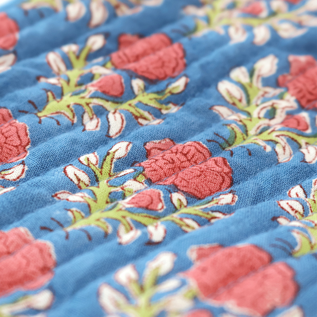 「ブロックプリント」は木版を使って、職人がひと版ひと版、手でスタンプを押すように生地の上にプリントするインドの伝統的な技法です。