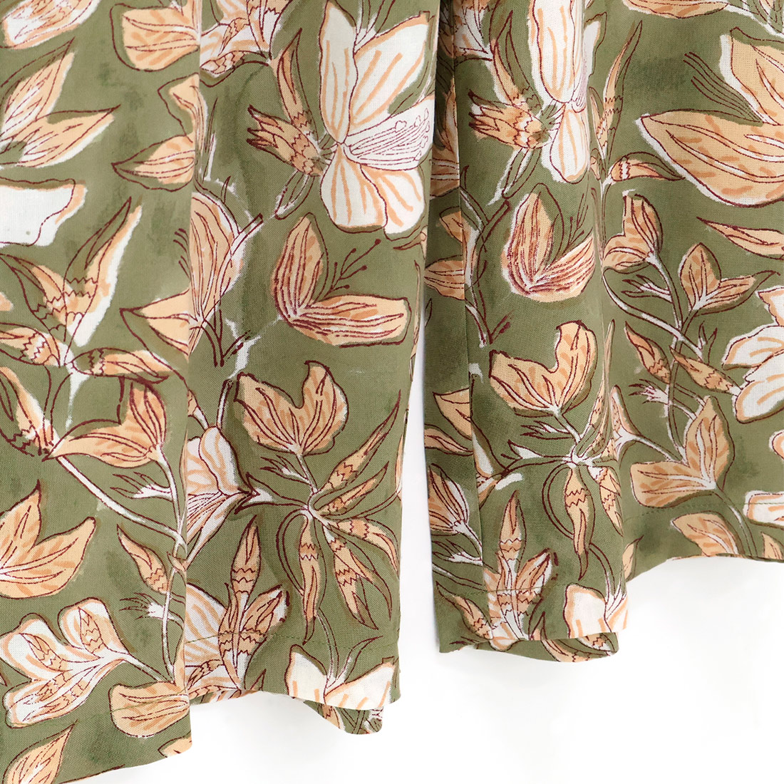 インドの伝統技法「ブロックプリント」で作られた独特の柄が、リラックス感の中にもさりげない個性をプラスします。