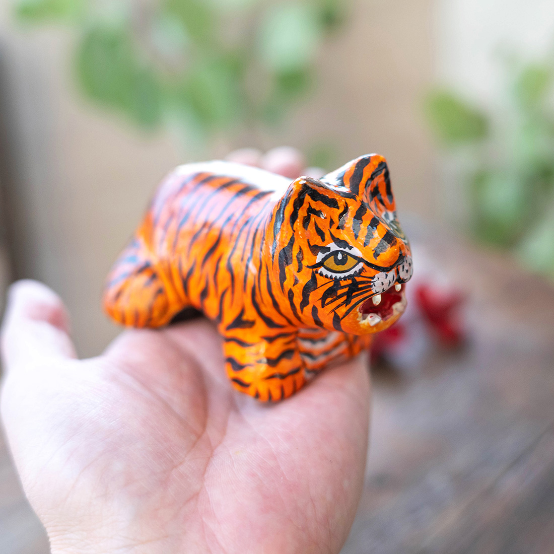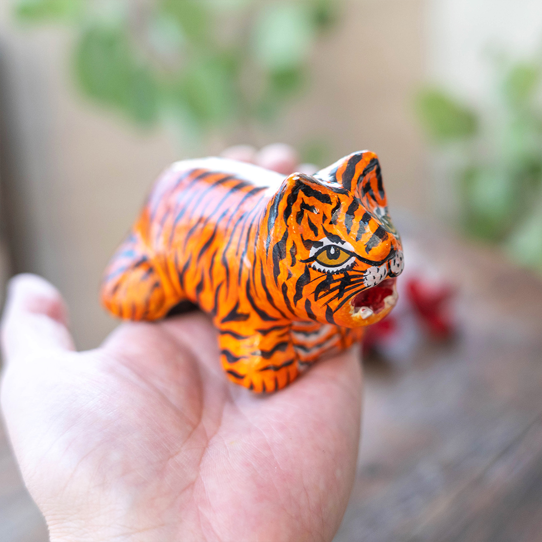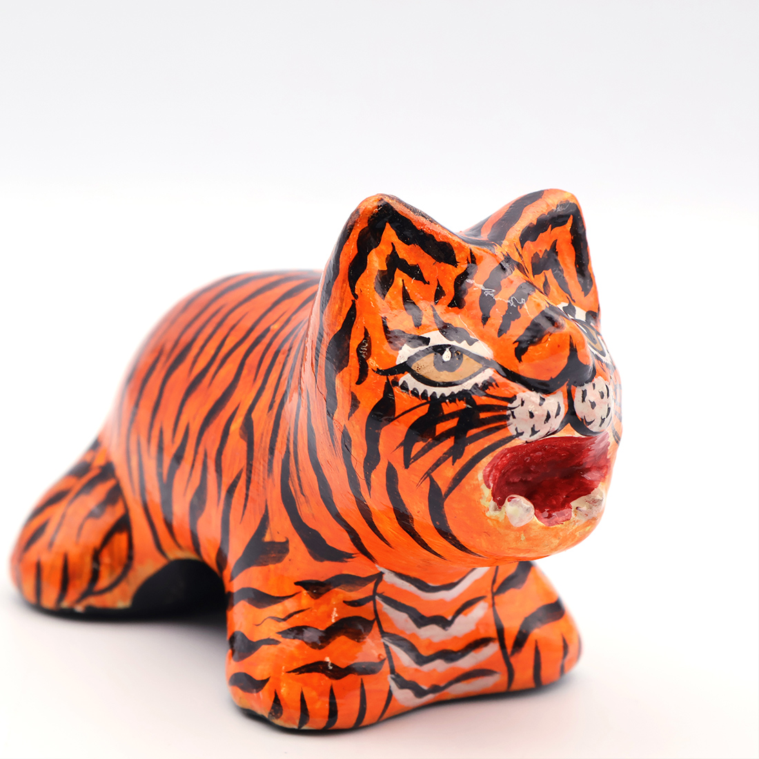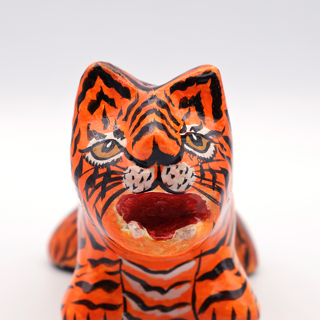 口を開けた愛嬌のある表情が印象的なトラの置物。