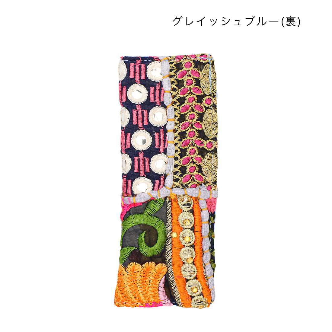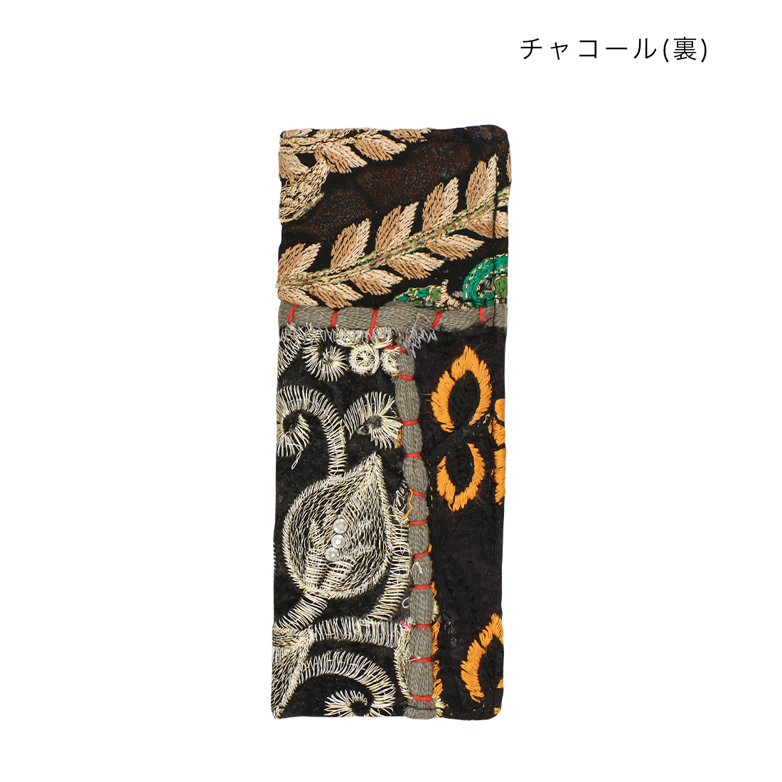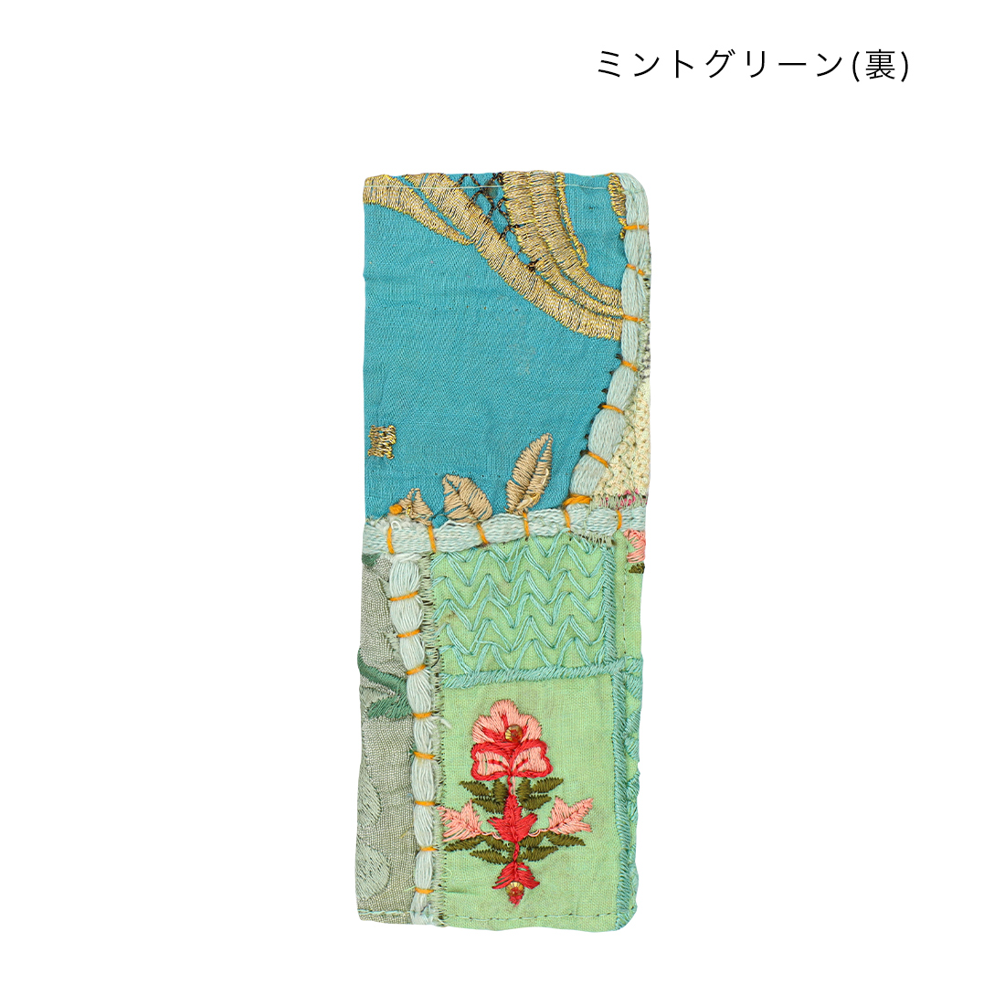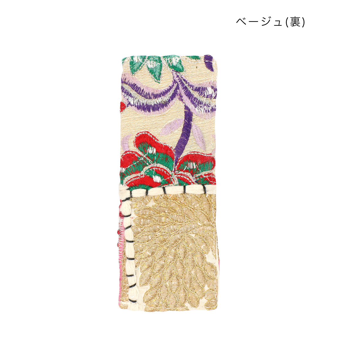 ケースは北インドに伝わるカンバディアパッチワーク。サリーやクルタなど、華やかな刺繍やビーズが施された伝統衣装の希少なヴィンテージ布をひとつひとつ手でつなぎ合わせた生地です。