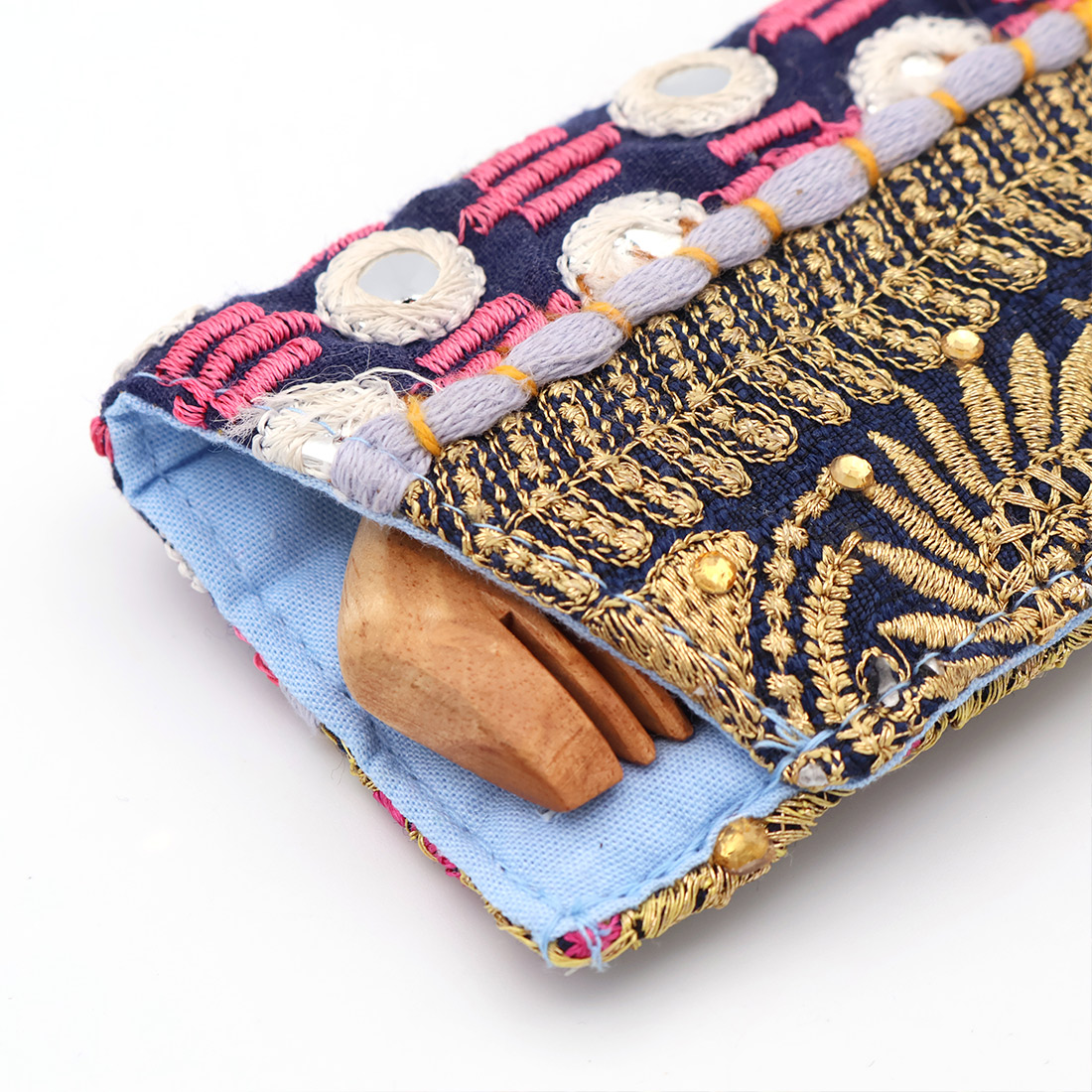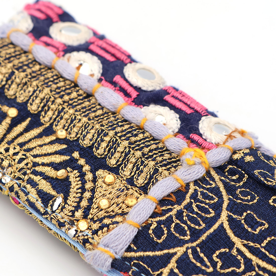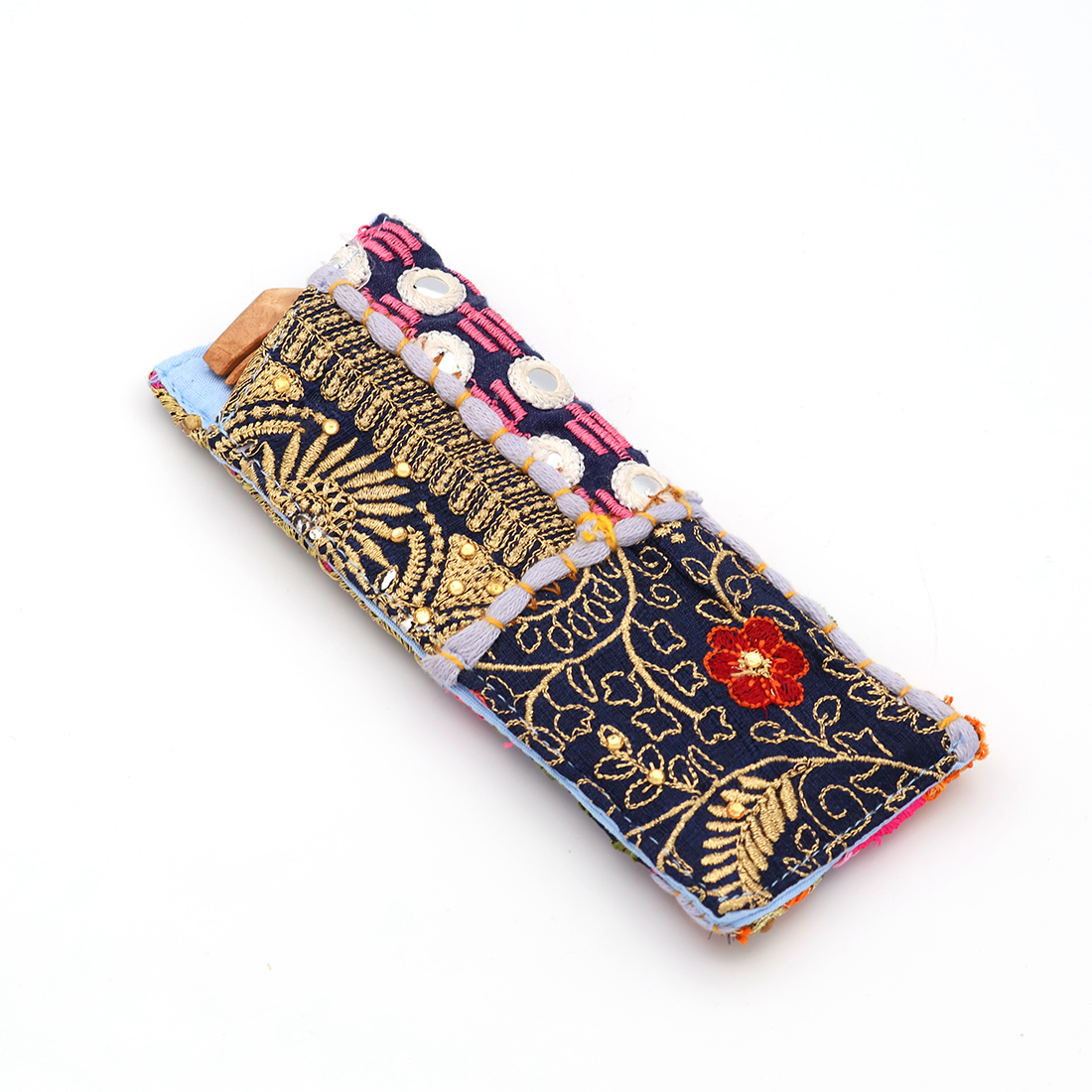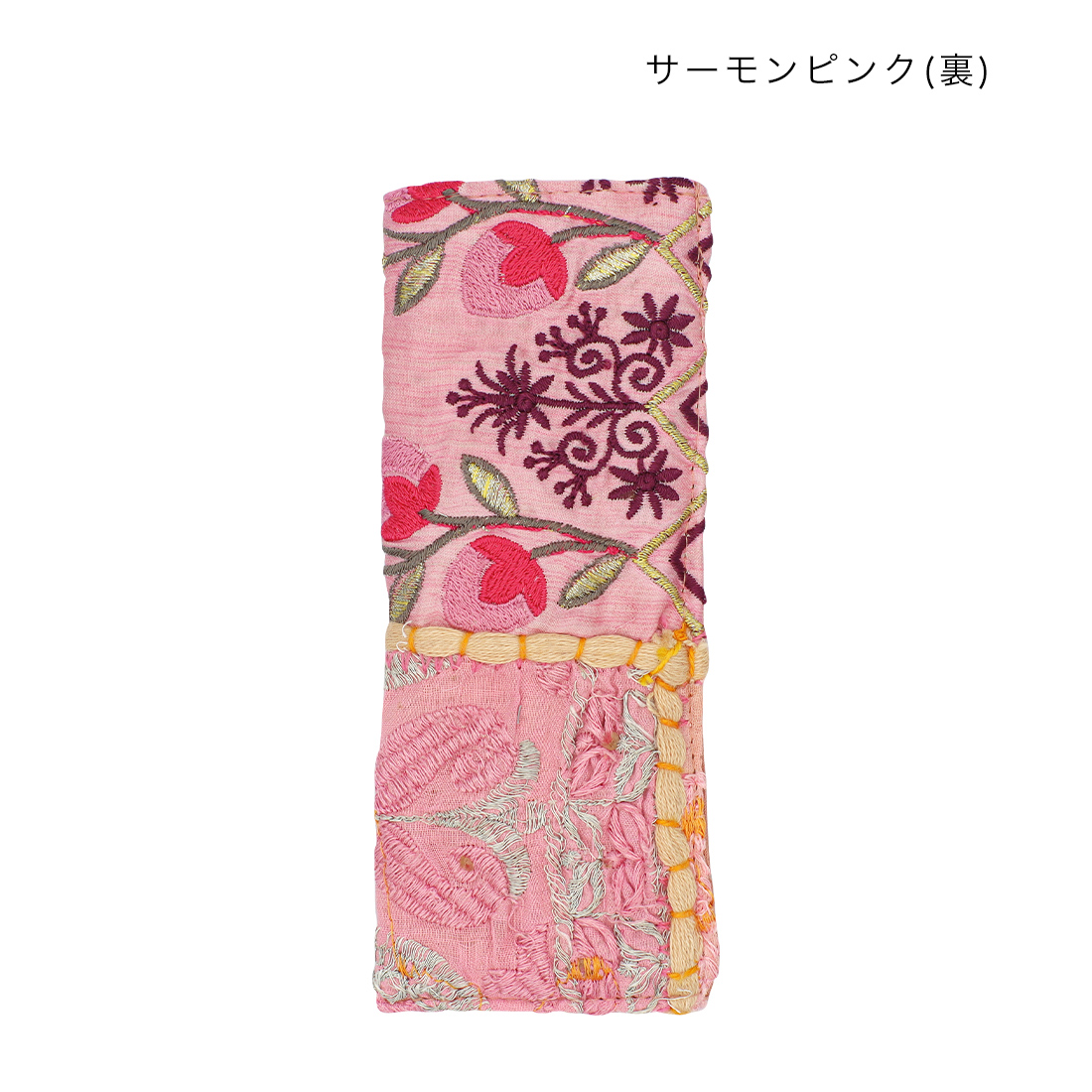ケースは北インドに伝わるカンバディアパッチワーク。サリーやクルタなど、華やかな刺繍やビーズが施された伝統衣装の希少なヴィンテージ布をひとつひとつ手でつなぎ合わせた生地です。