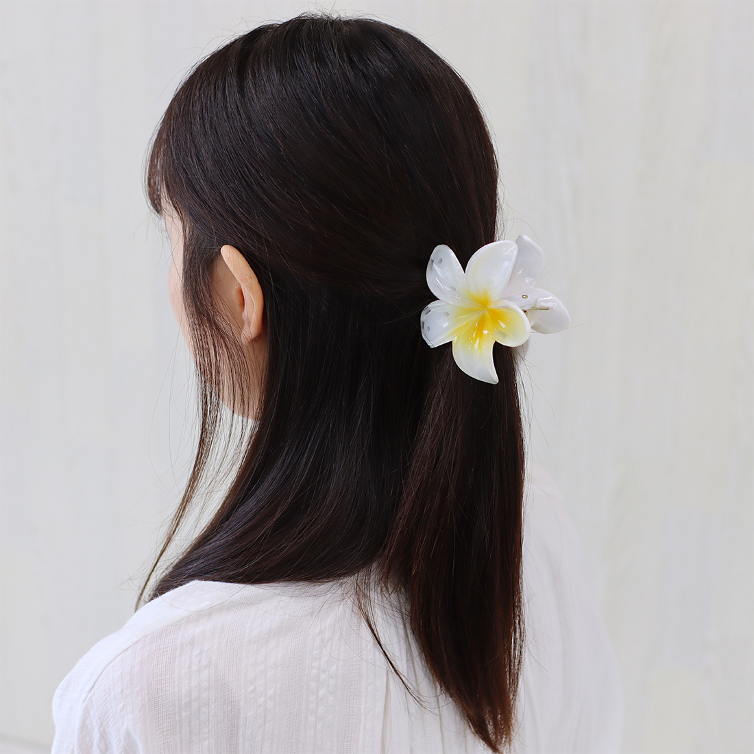 まとめ髪を明るく彩るプルメリアのヘアクリップ