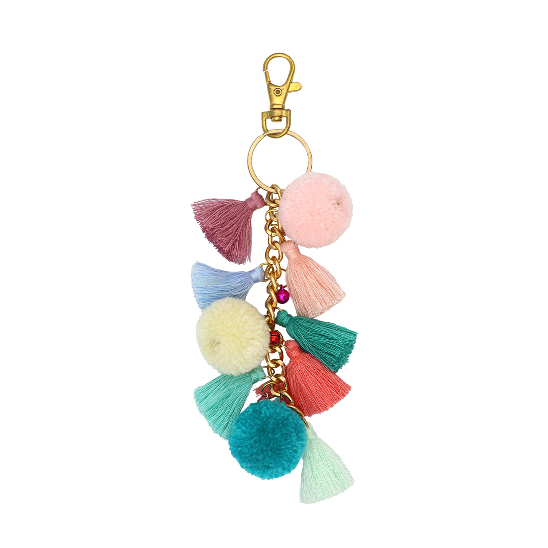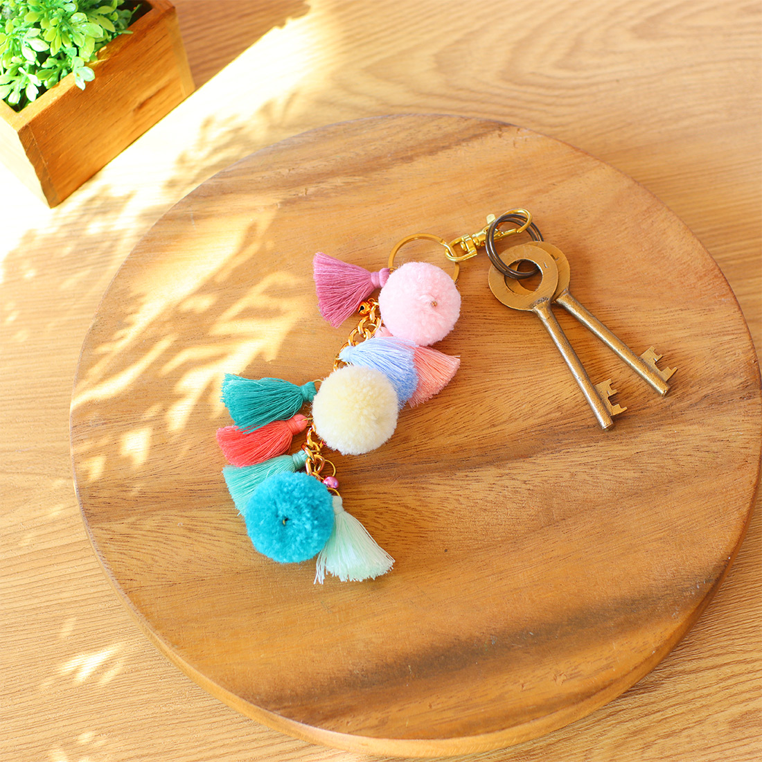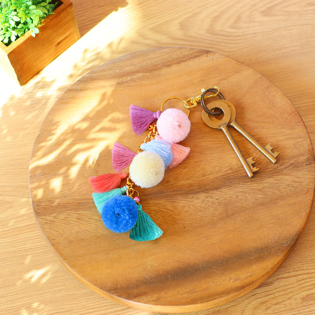 カラフルなポンポンとタッセルがたくさんついたポップなキーチャーム。