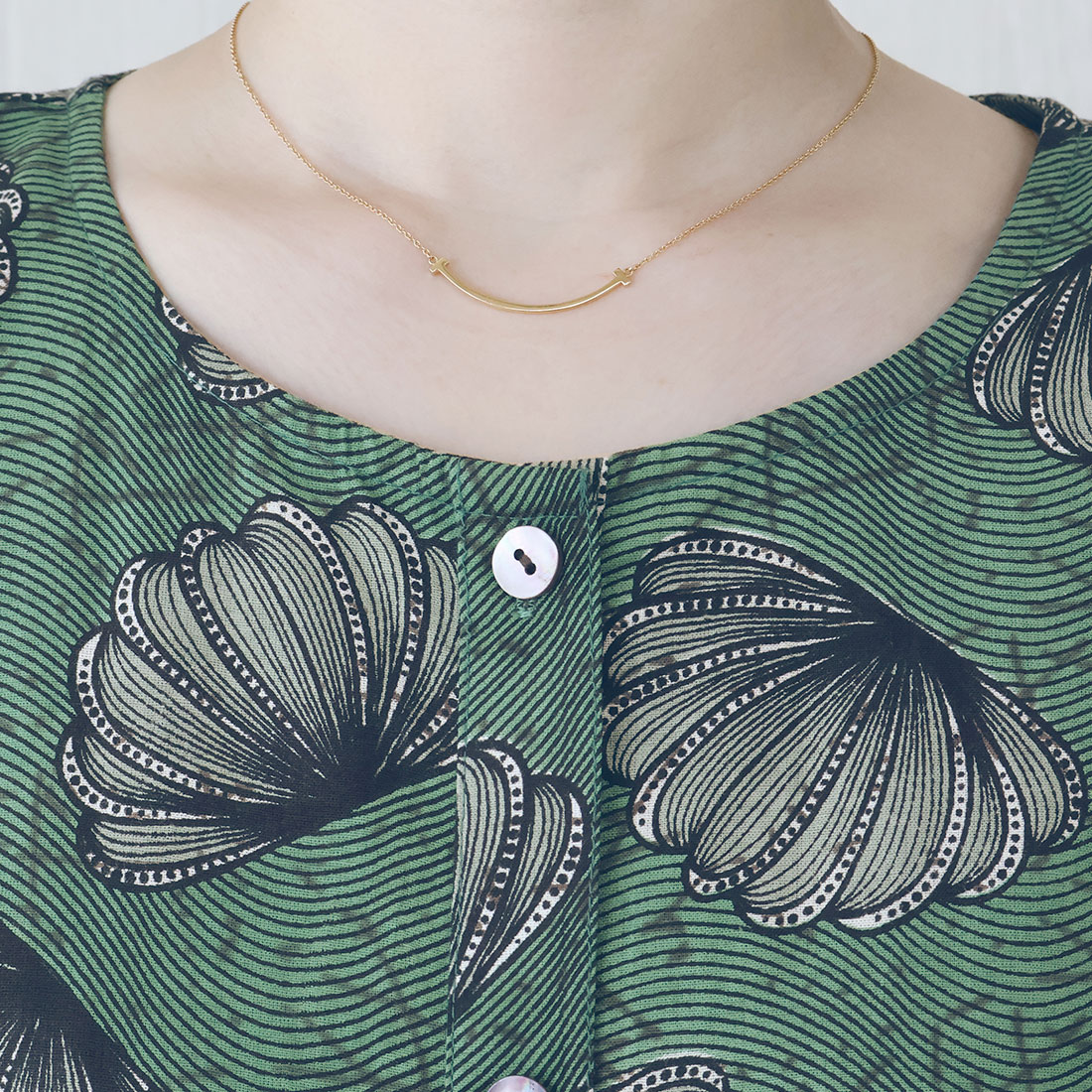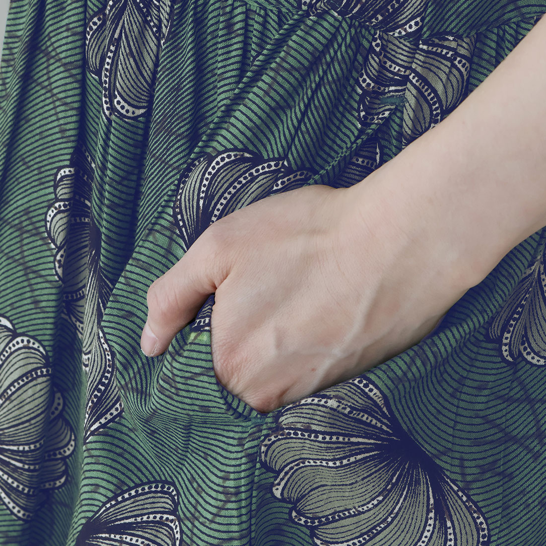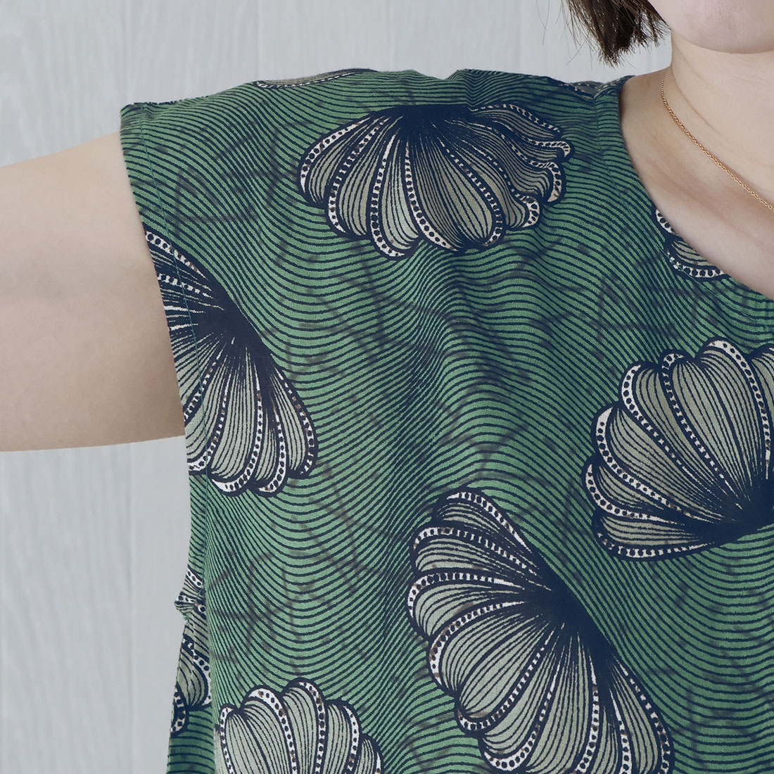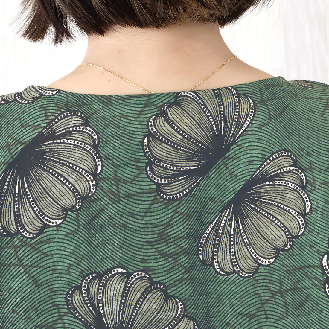 大胆なデザインのアフリカンプリントを、落ち着いた色合いでシックに仕上げました。