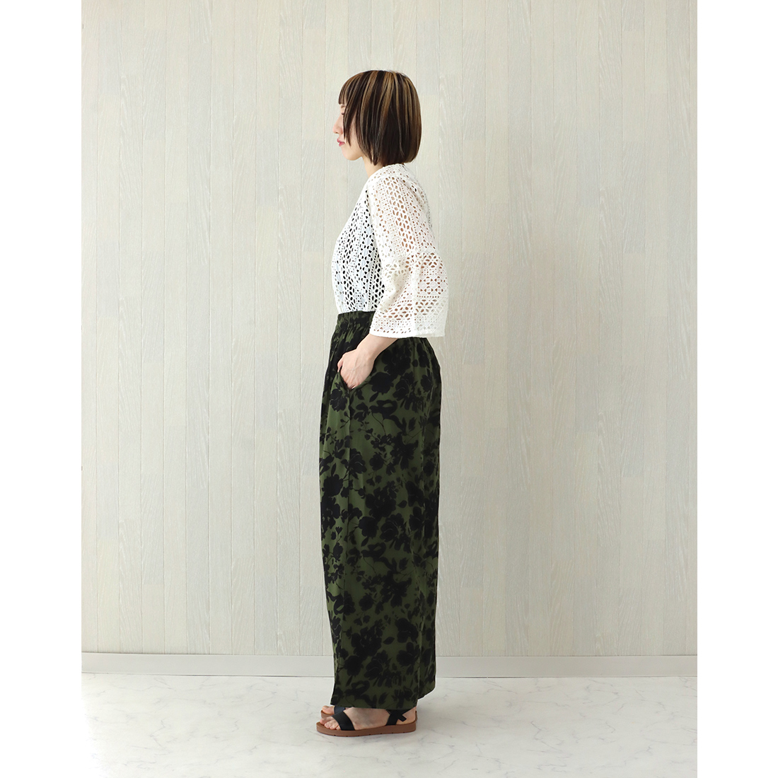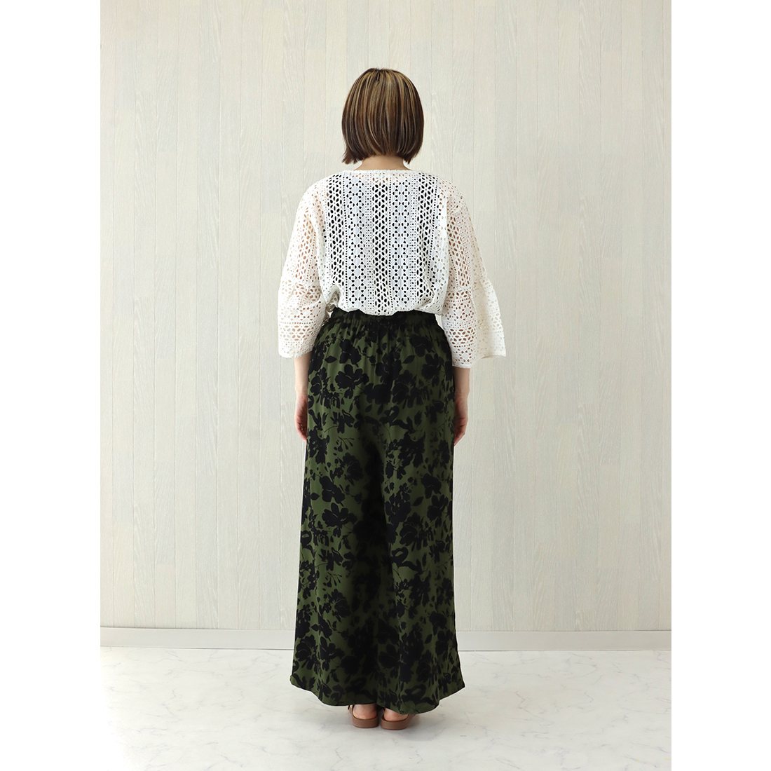 シックなプリントが目を引くパンツ