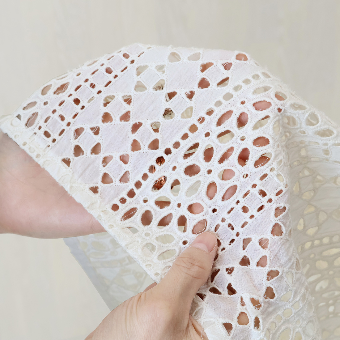 生地に穴をあけ、その縁をかがっていくシフリー刺しゅうを全面に施しました。
