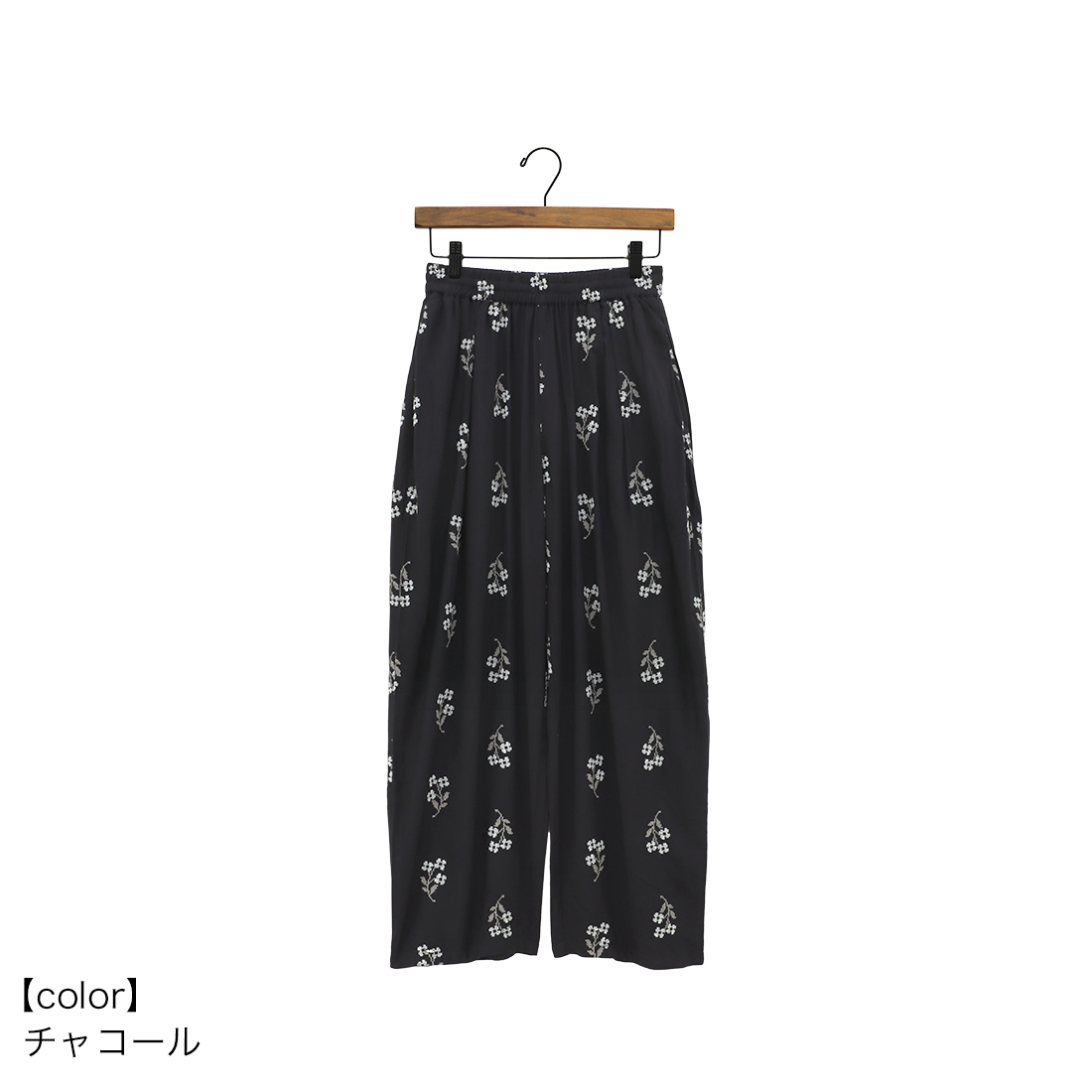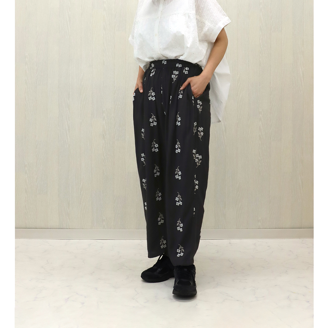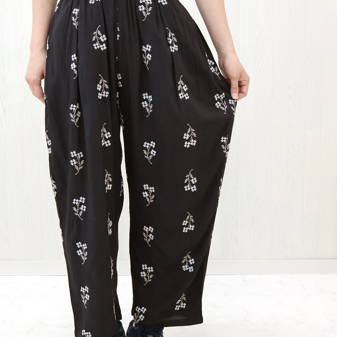 クロスステッチの花柄が目を引くパンツ