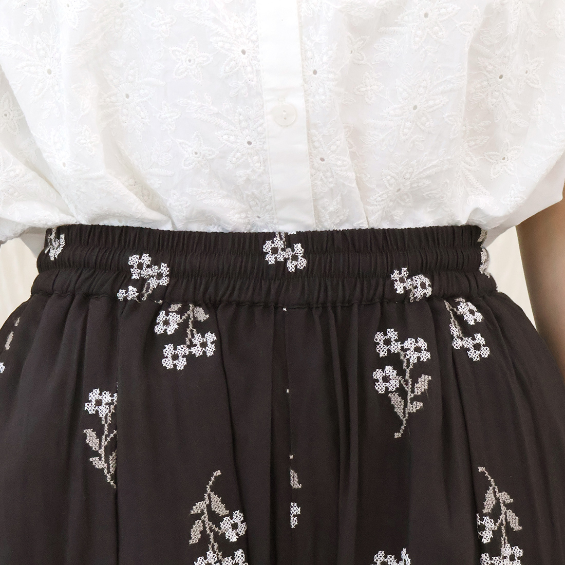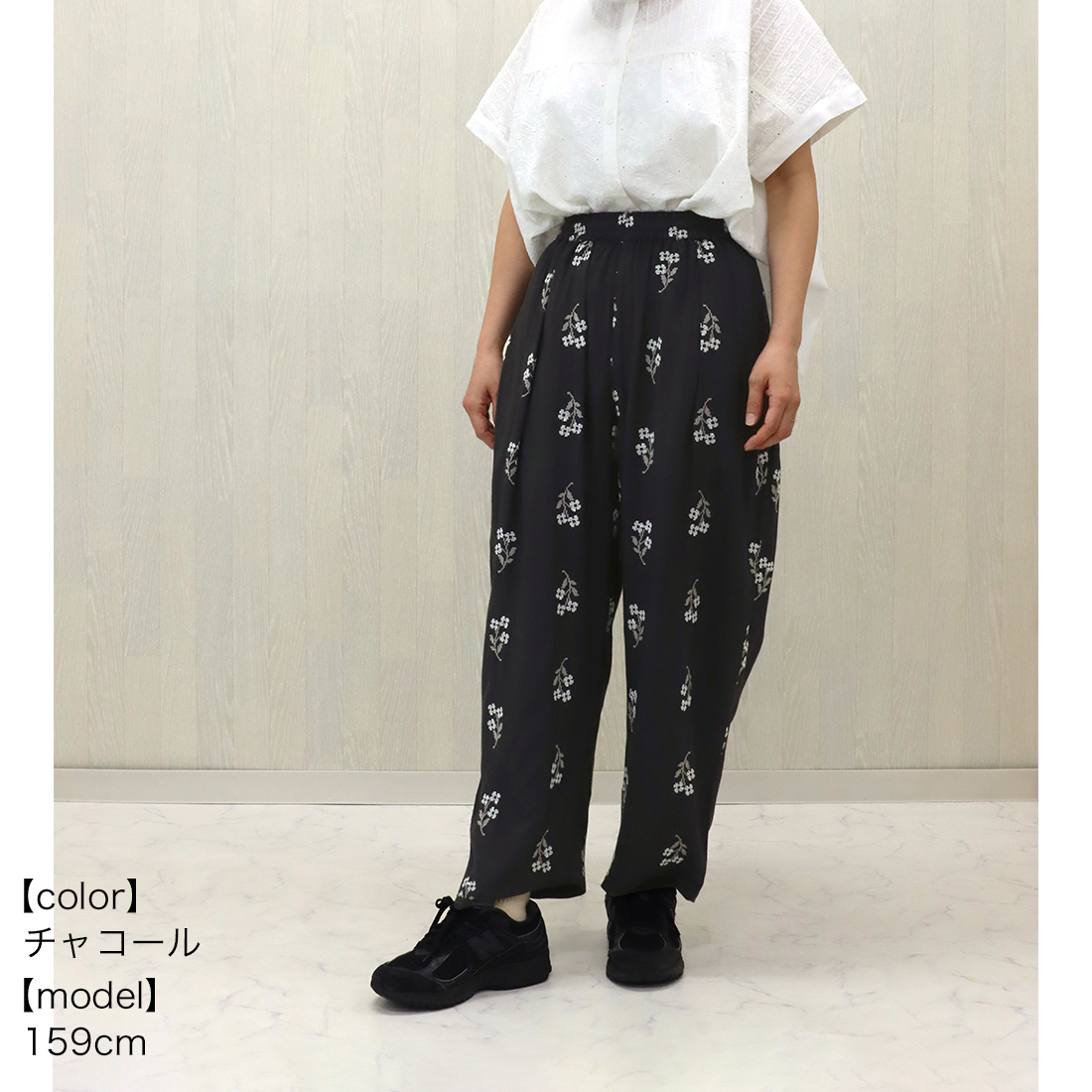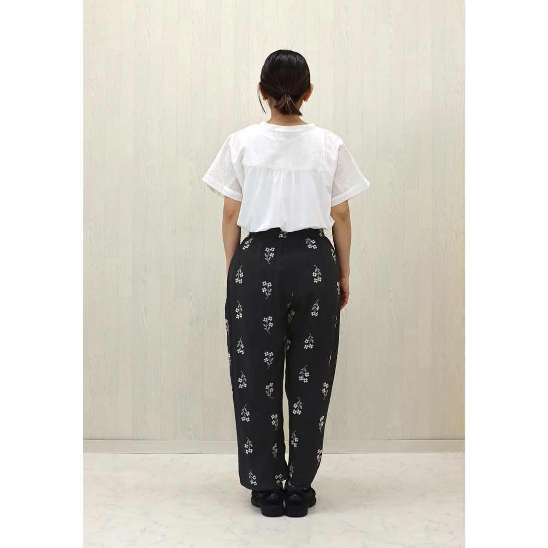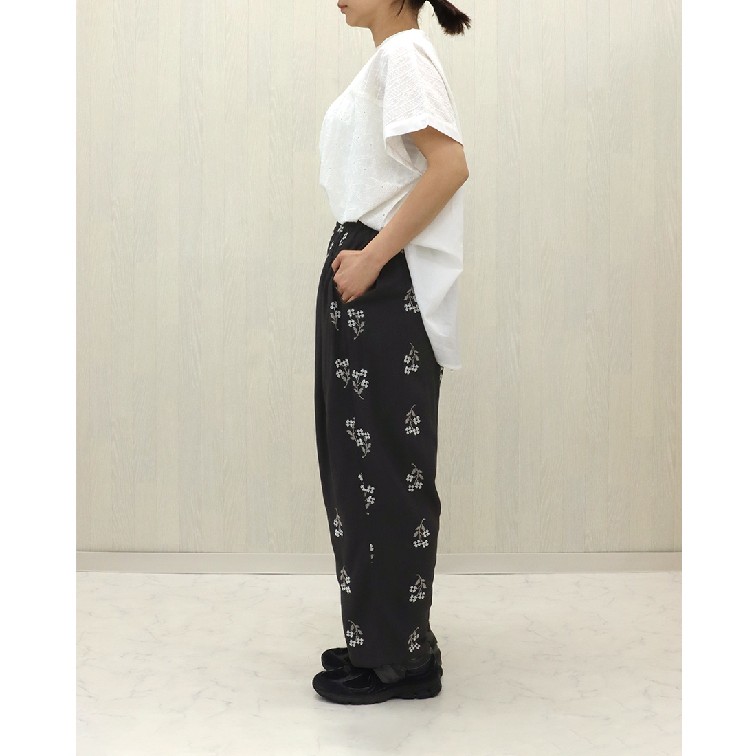 クロスステッチの花柄が目を引くパンツ
