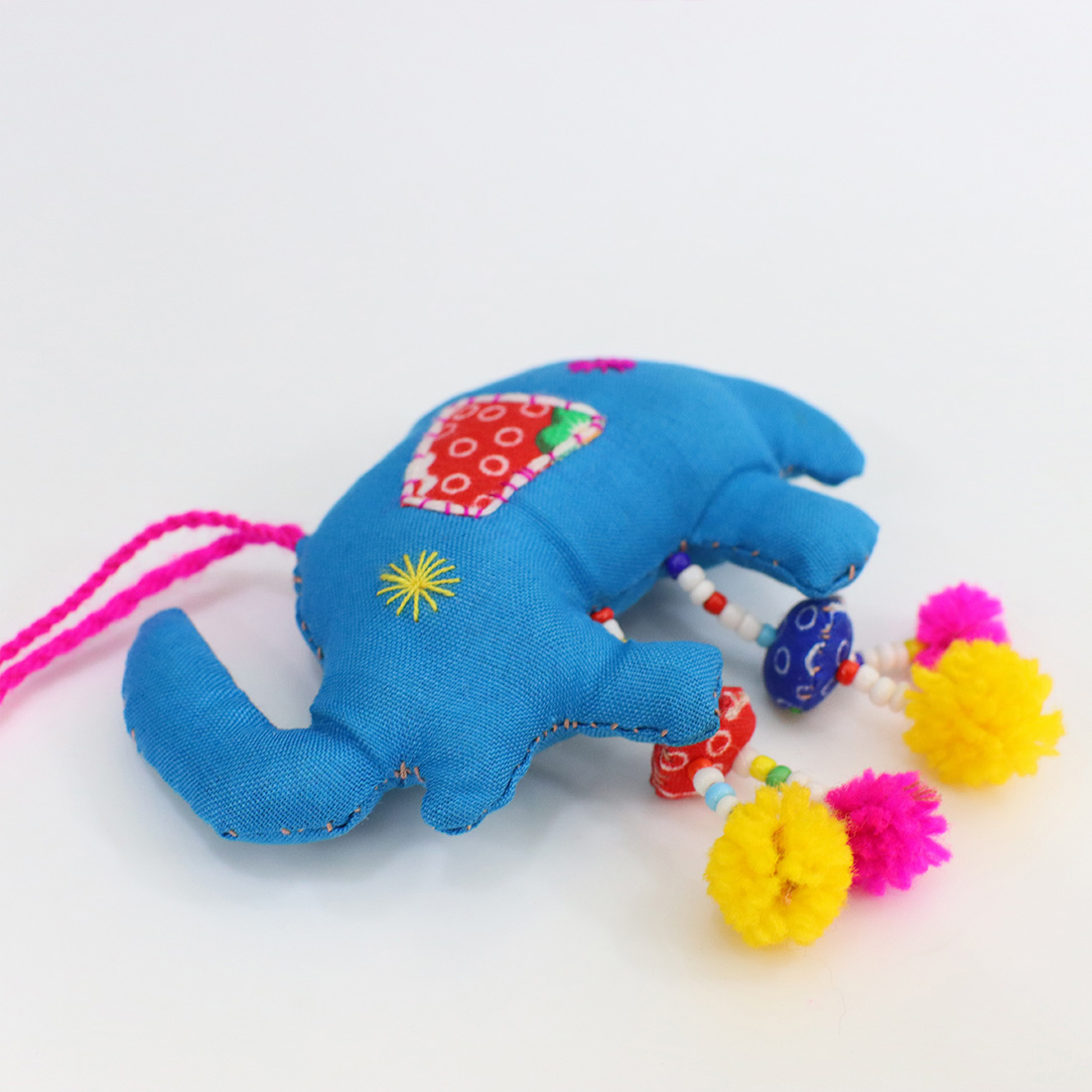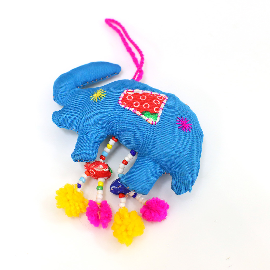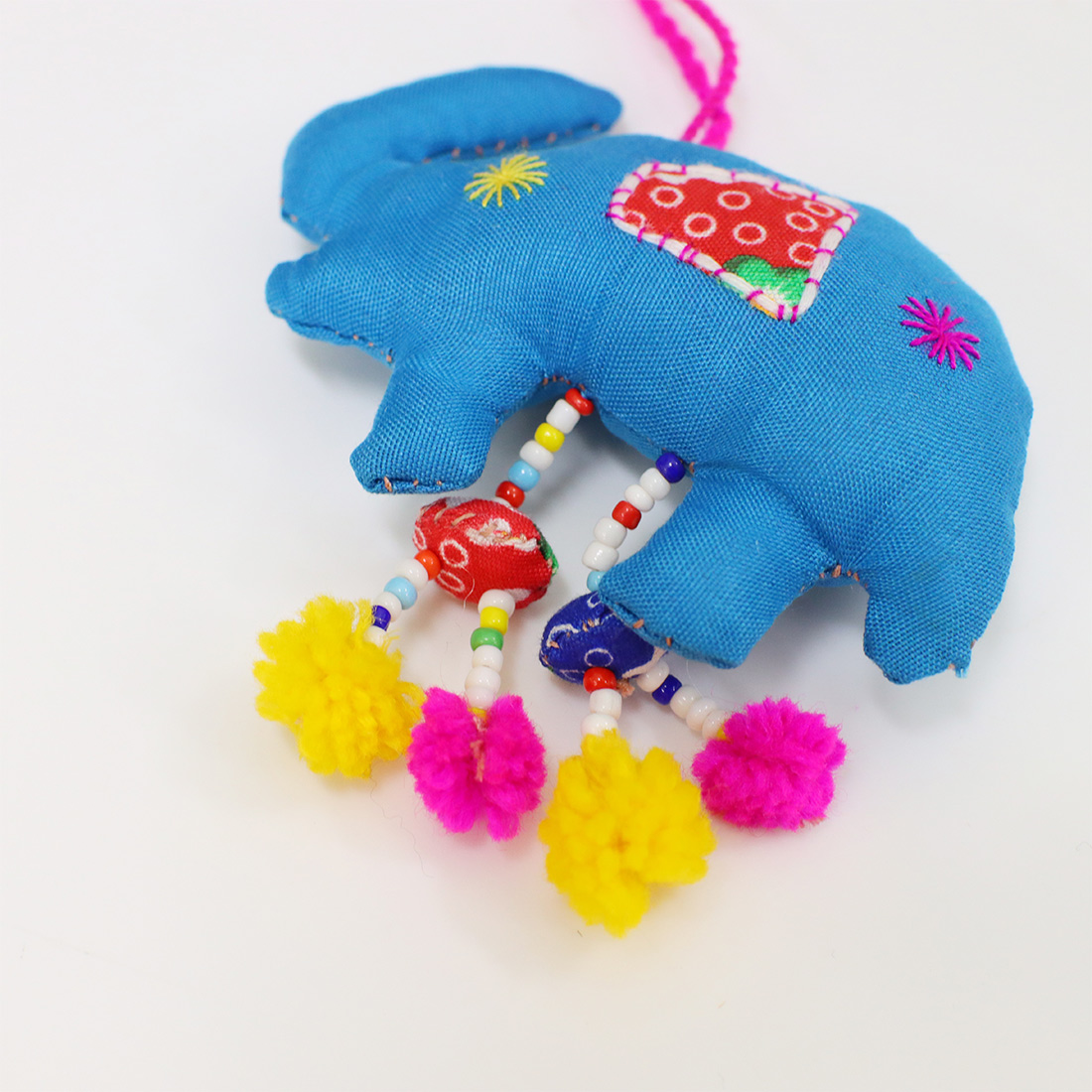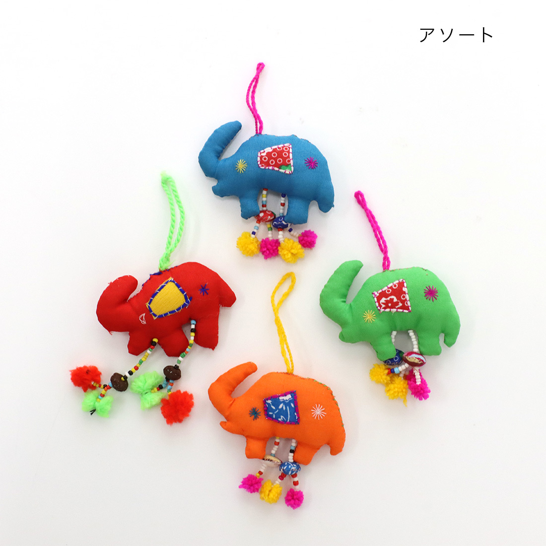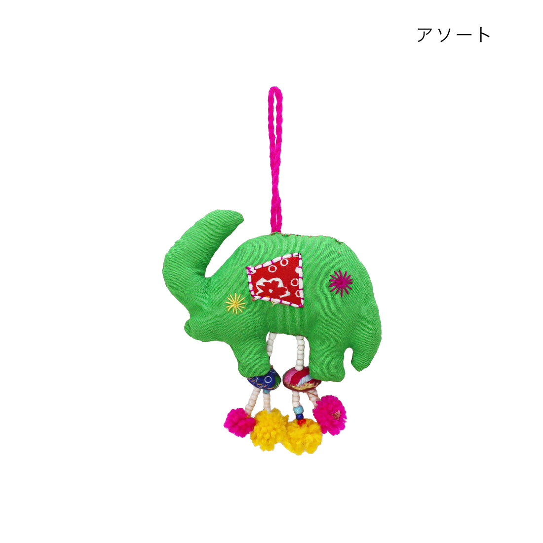 ラオスからやってきたハンドメイドのゾウチャームです。足元についているポンポンの飾りがにぎやか♪手作りならではのあたたかみのある雰囲気でお部屋の飾りにもお使いいただけます。