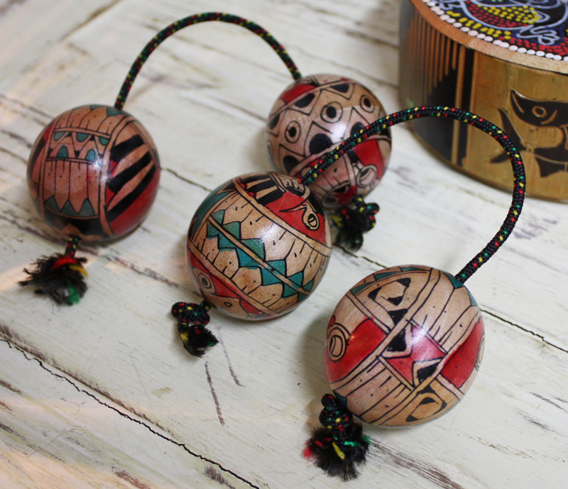 アフリカの民族楽器「アサラト」「ケスケス」を模して作ったのが「パチカ」です。木製の半球を張り合わせて中にビーズが入っています。