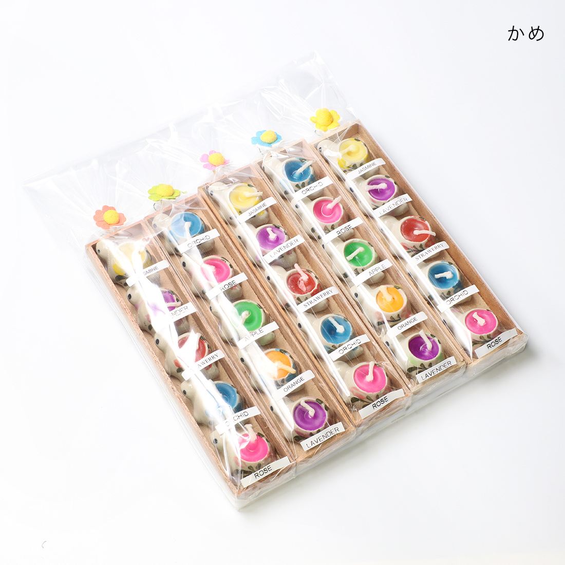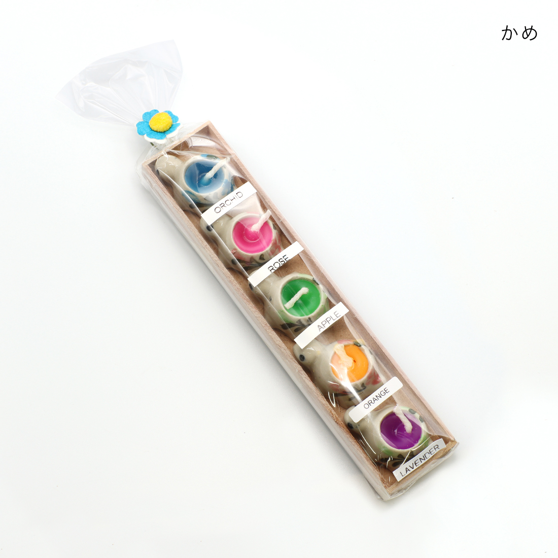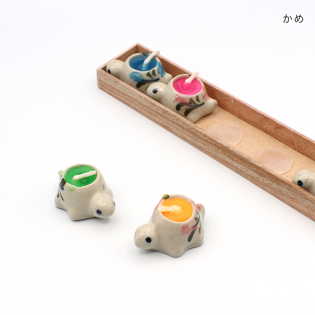 陶器製の小さなゾウや、ウサギ、カエル、かめのかわいいキャンドル。