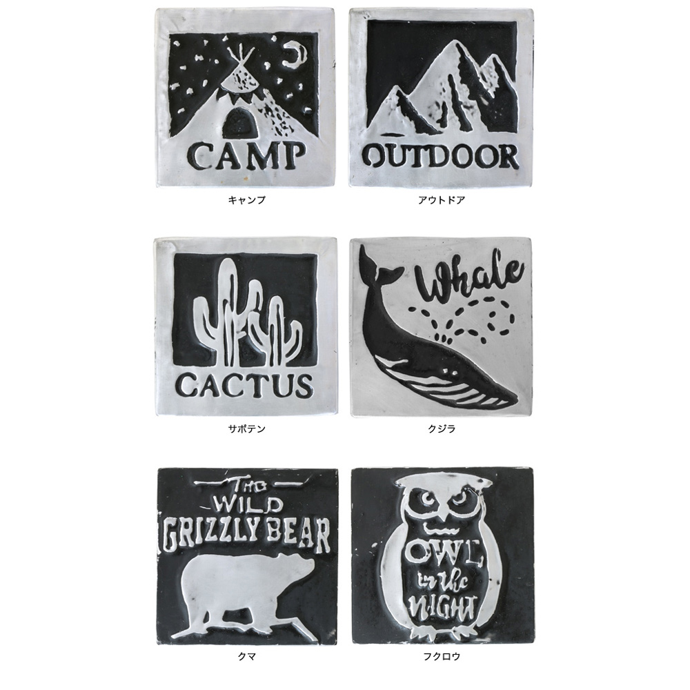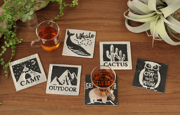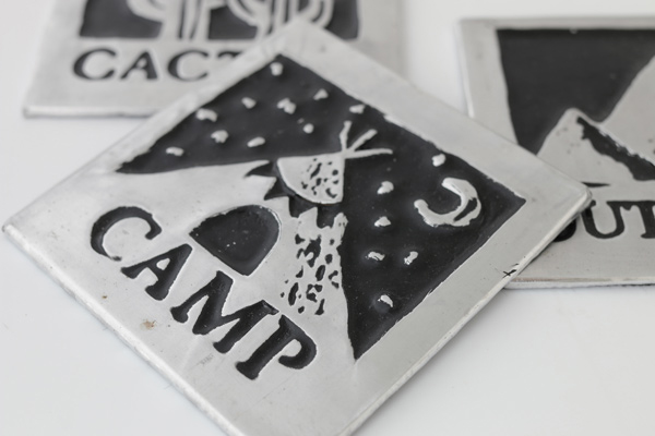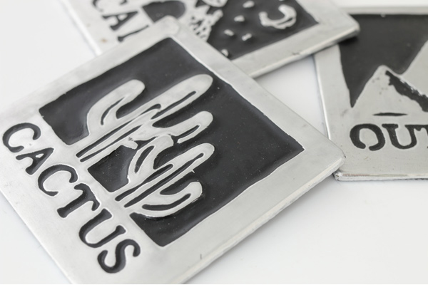エンボス加工したアルミ製コースター。凹部分が黒く、凸部分がシルバーになっていて、立体感のある絵柄とクールな印象がGOOD!