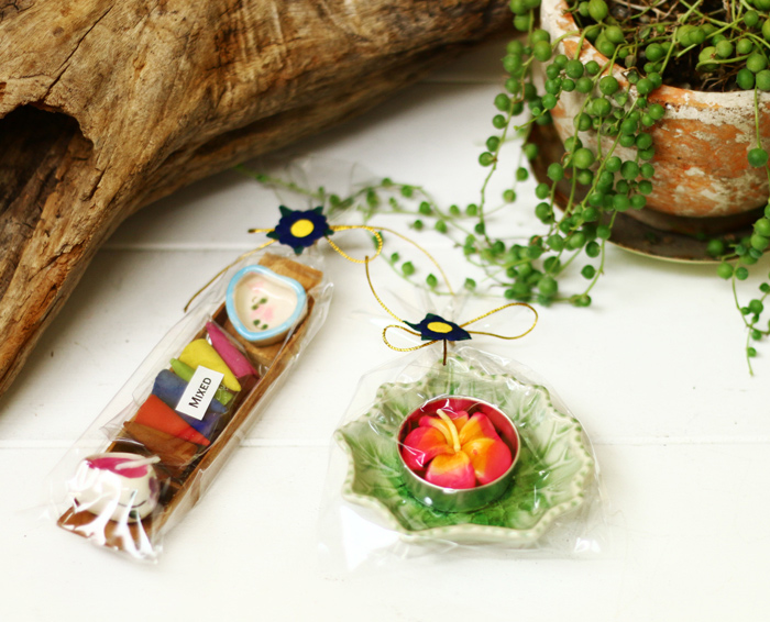 グレープリーフの皿とプルメリアティーライトキャンドルのセット。ちょっとしたプレゼントに◎。