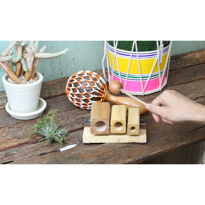 3つのブロックを並べた木琴。バチを使って音を奏でます。