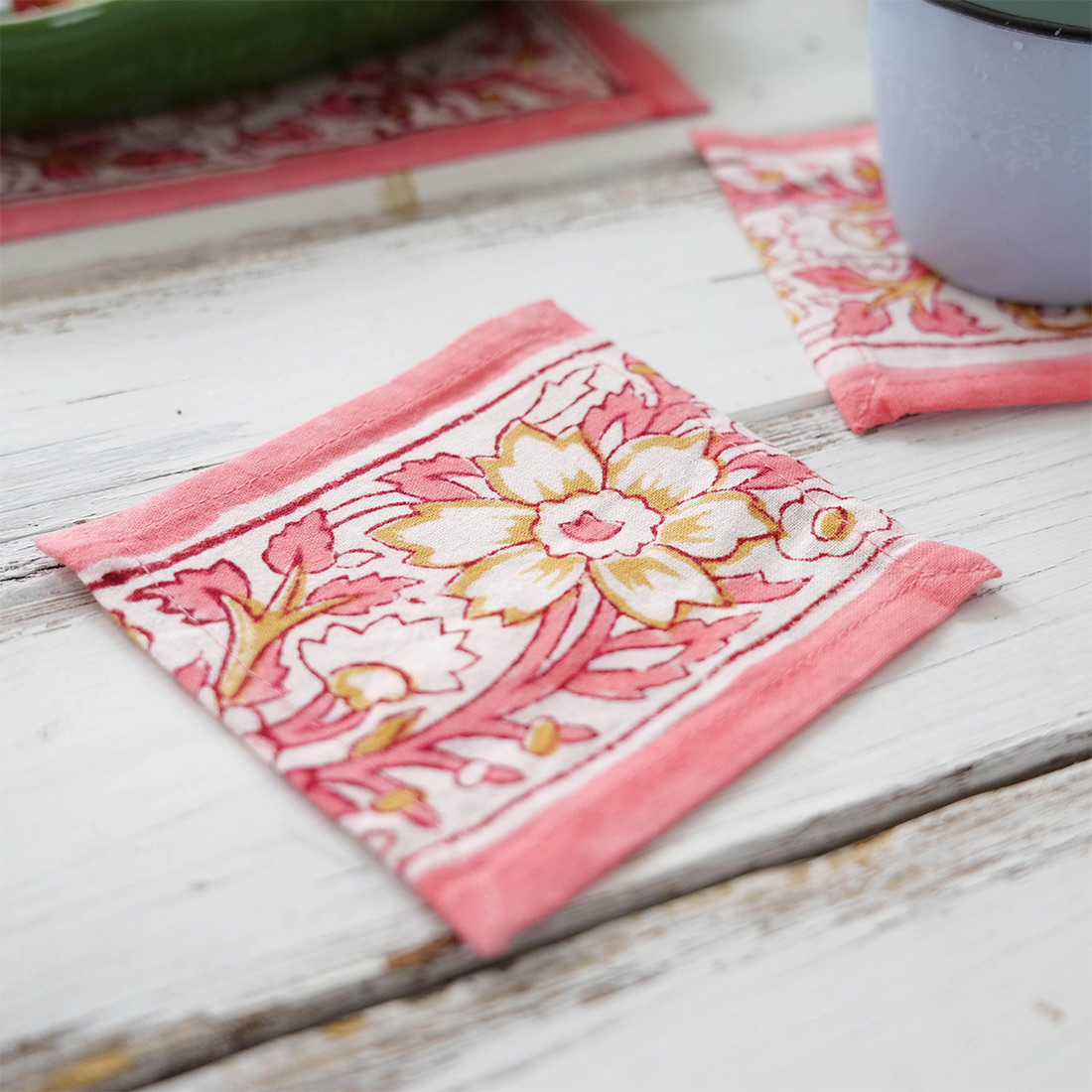 生地に木版(ブロック)を1つ1つ手で押していき絵柄をプリントするインドのブロックプリントのコースター。手作りのぬくもりを感じられるシリーズです。