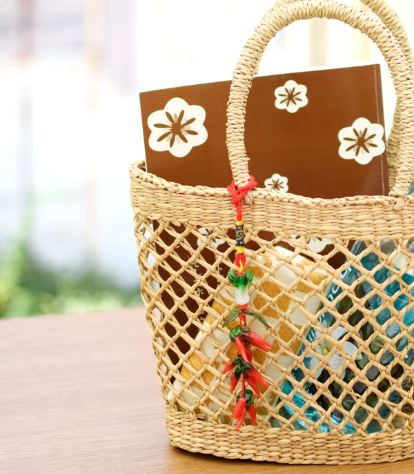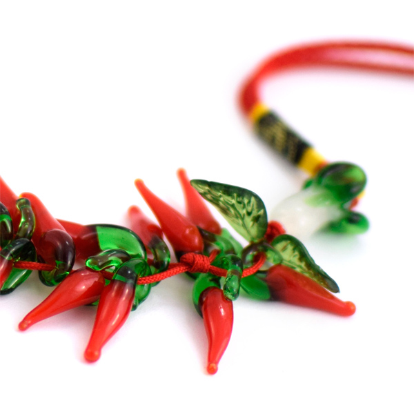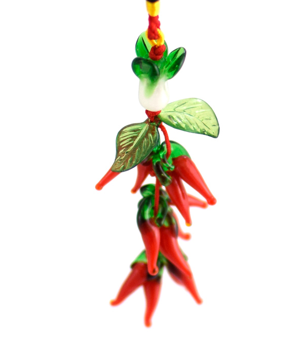 魔除け・厄除けの効果があるという唐辛子のチャーム。ガラス製の唐辛子が取れると厄を落としたことになり、縁起が良いとされています。ぜひ、お部屋やバッグなどに飾ってください。