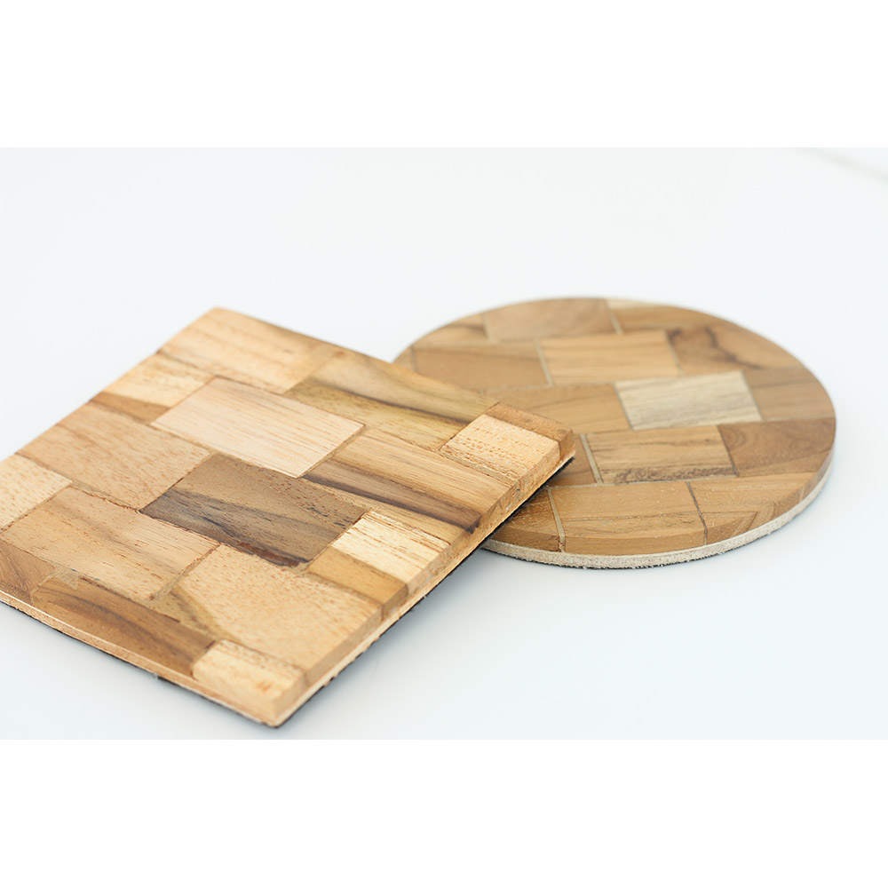 1つずつ色合いや木目の異なるチーク材をタイル状に組み合わせたコースター。テーブルコーディネートが楽しくなるアイテムです。