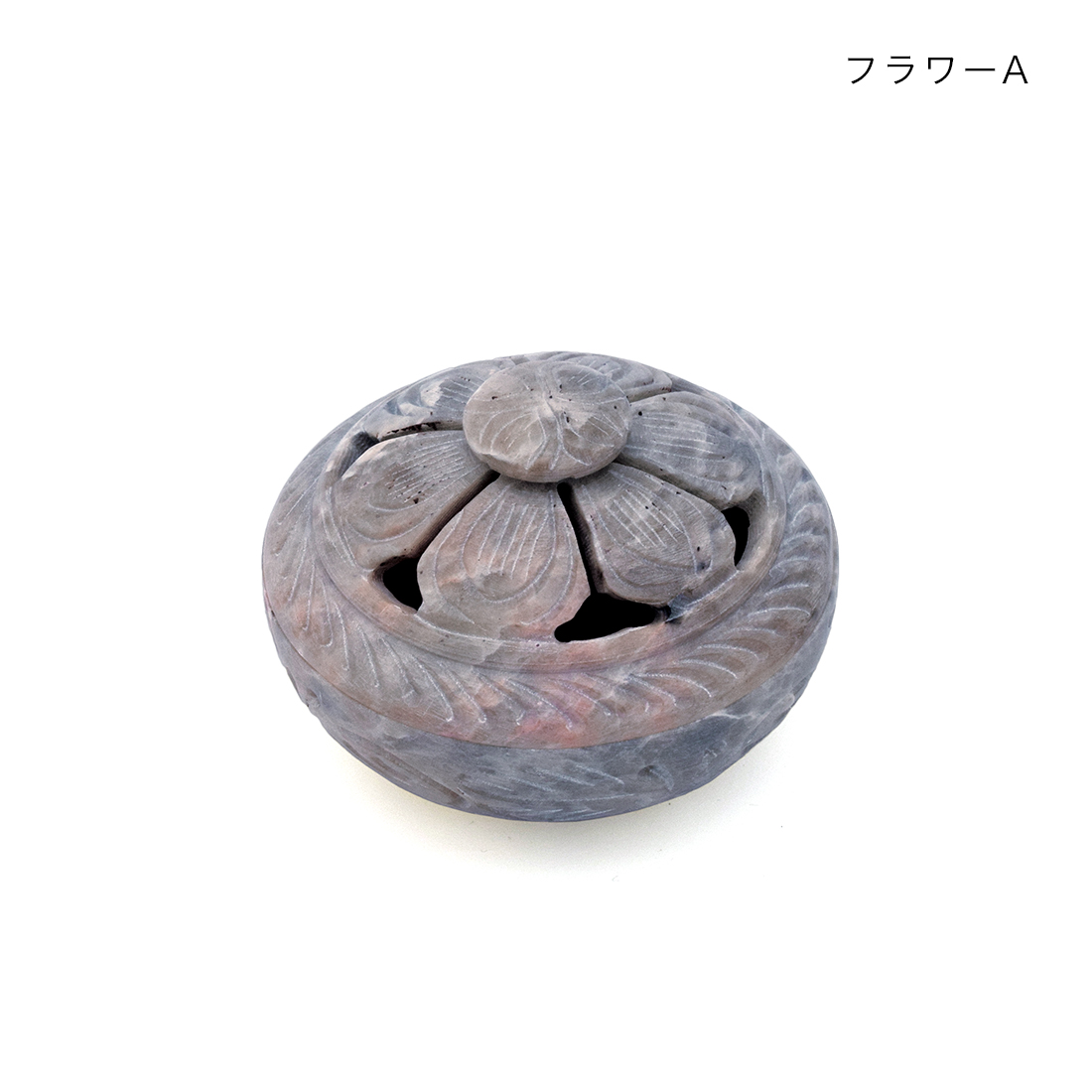 透かし彫りで素敵な柄をデザインしています。石の自然の表情を活かすためにペイントはしていません。ナチュラルな優しい風合いをお楽しみください。コーンタイプのお香を焚くことができます。アクセサリー入れとしてもおすすめです。