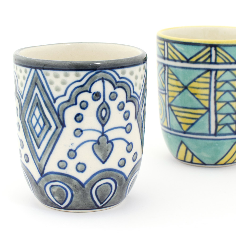 ひとつひとつが手描きの素朴な味わいの中にインドらしいカラフルでエキゾチックな柄と色で食卓が彩ります。