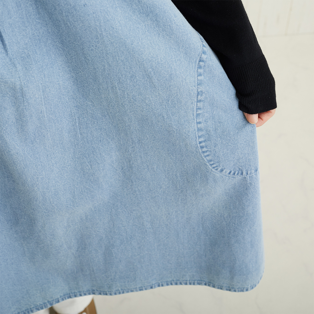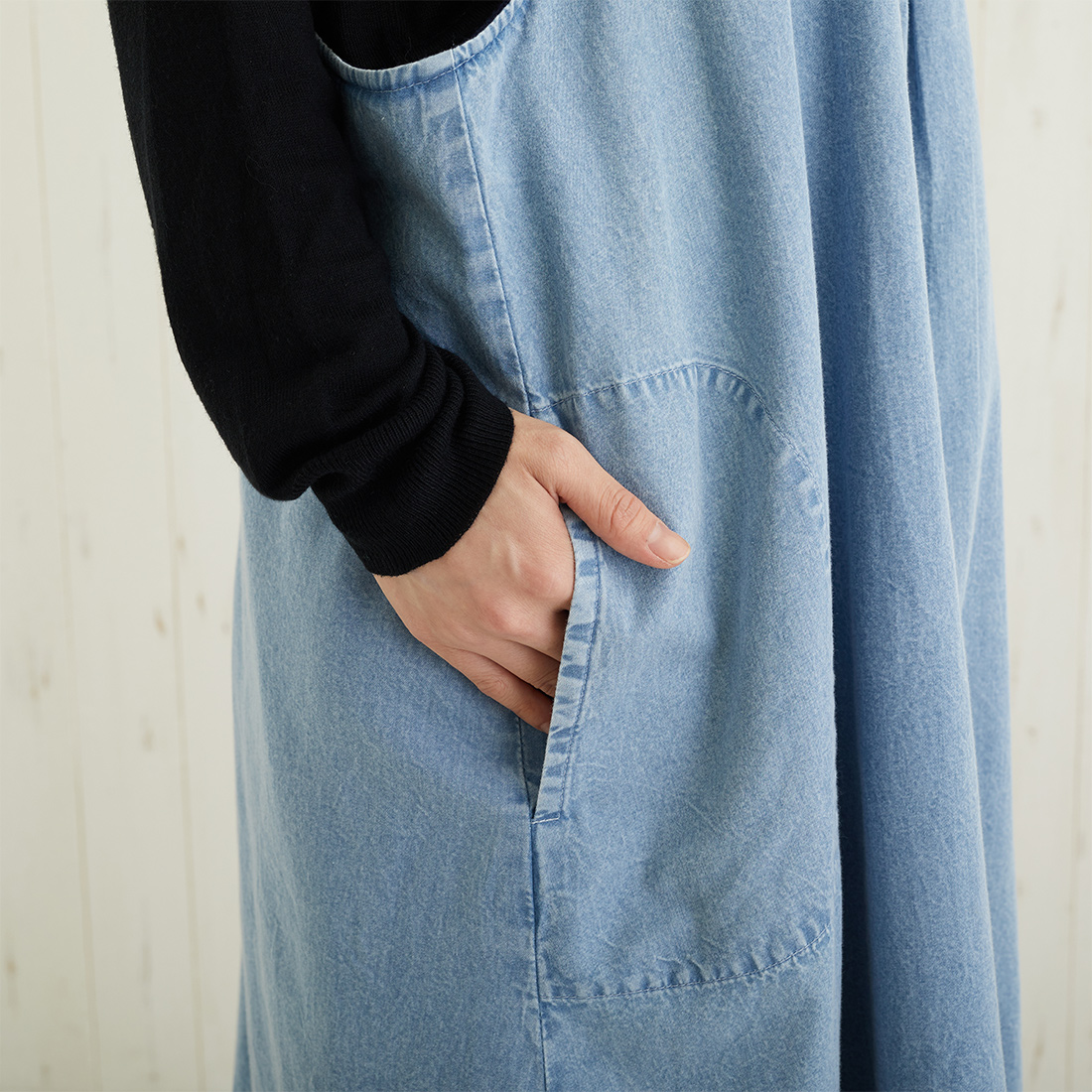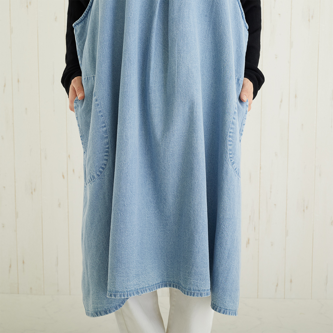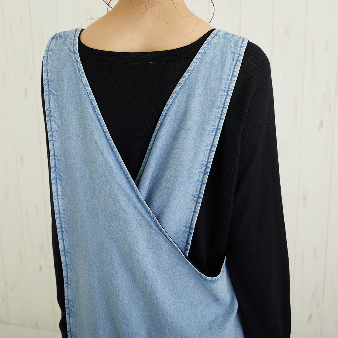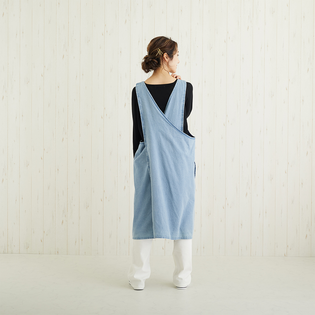 後ろがクロスになっていてボタンや紐を縛る必要のない、スポッと着られるタイプのエプロンです。