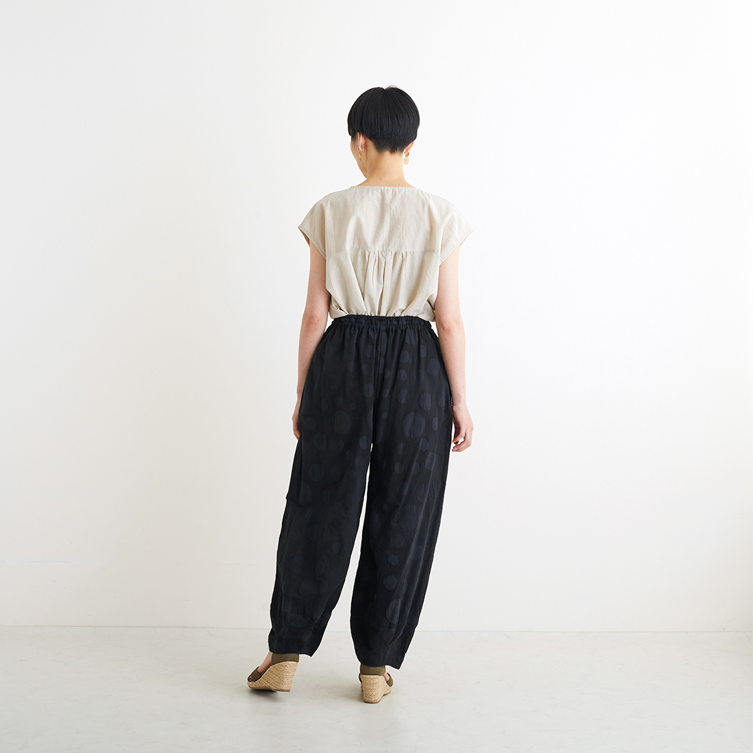 ランダムなドットモチーフをエンボス加工した味のあるファブリックで、大人かっこいいモダンで少しクールな印象をもたらします。セットアップで着れるのでコーディネイトも楽々♪