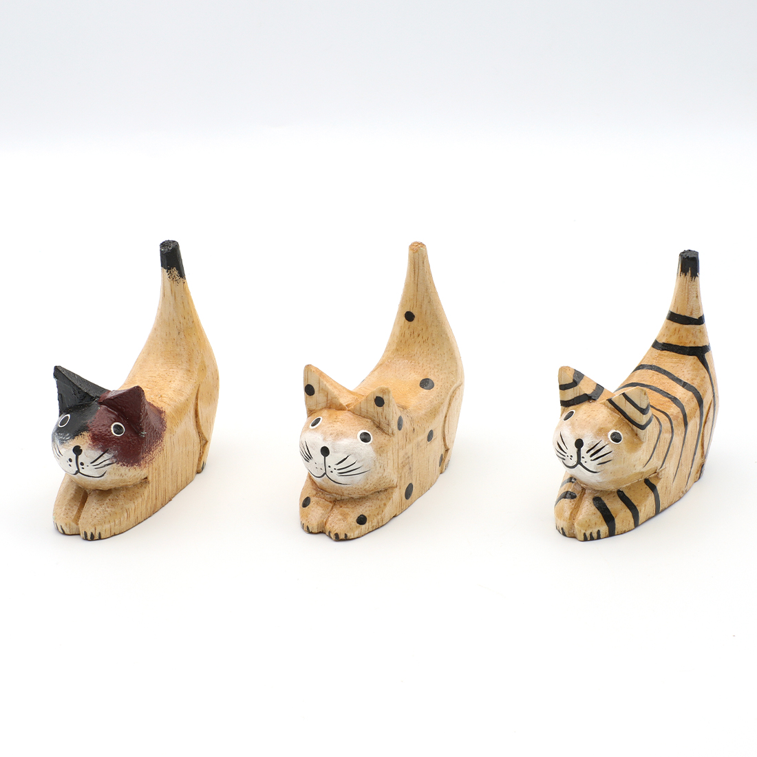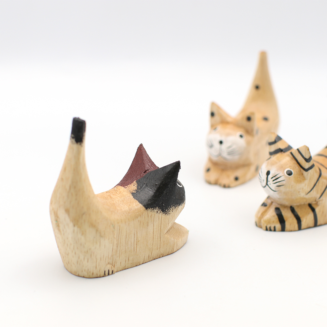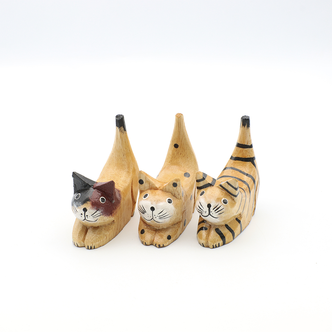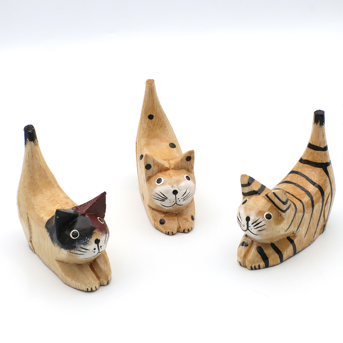 お尻を上げて獲物を狙っているかのようなポーズのネコの置物。デスクやシェルフにちょこんと飾って下さい。職人さんの手作りのため形や絵柄、色合いに多少のばらつきがある場合がございます。