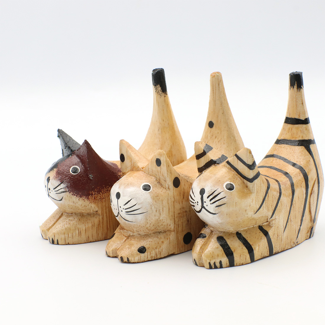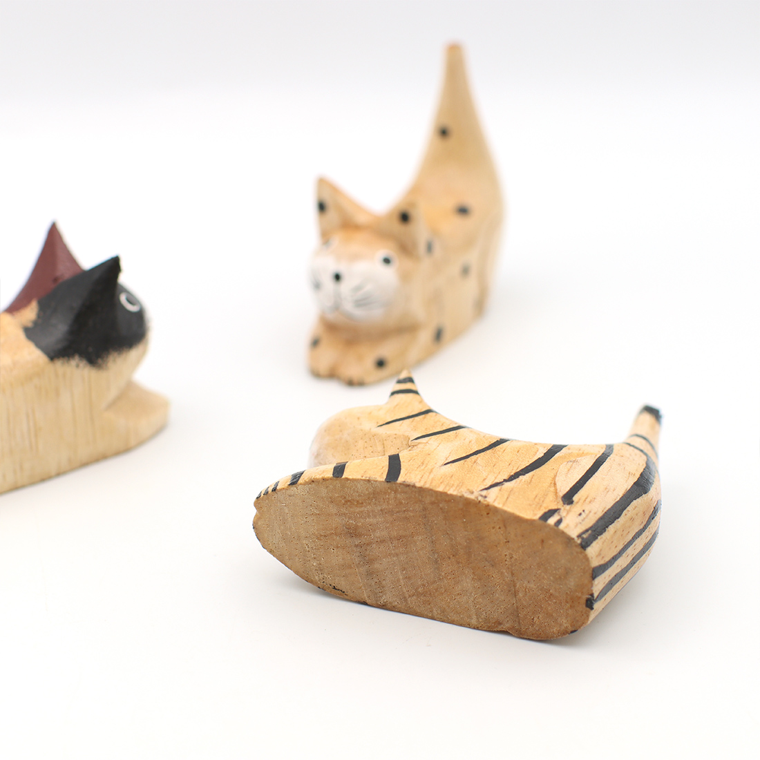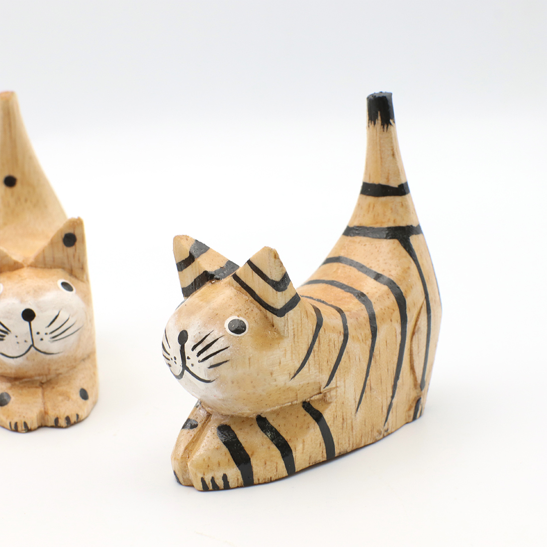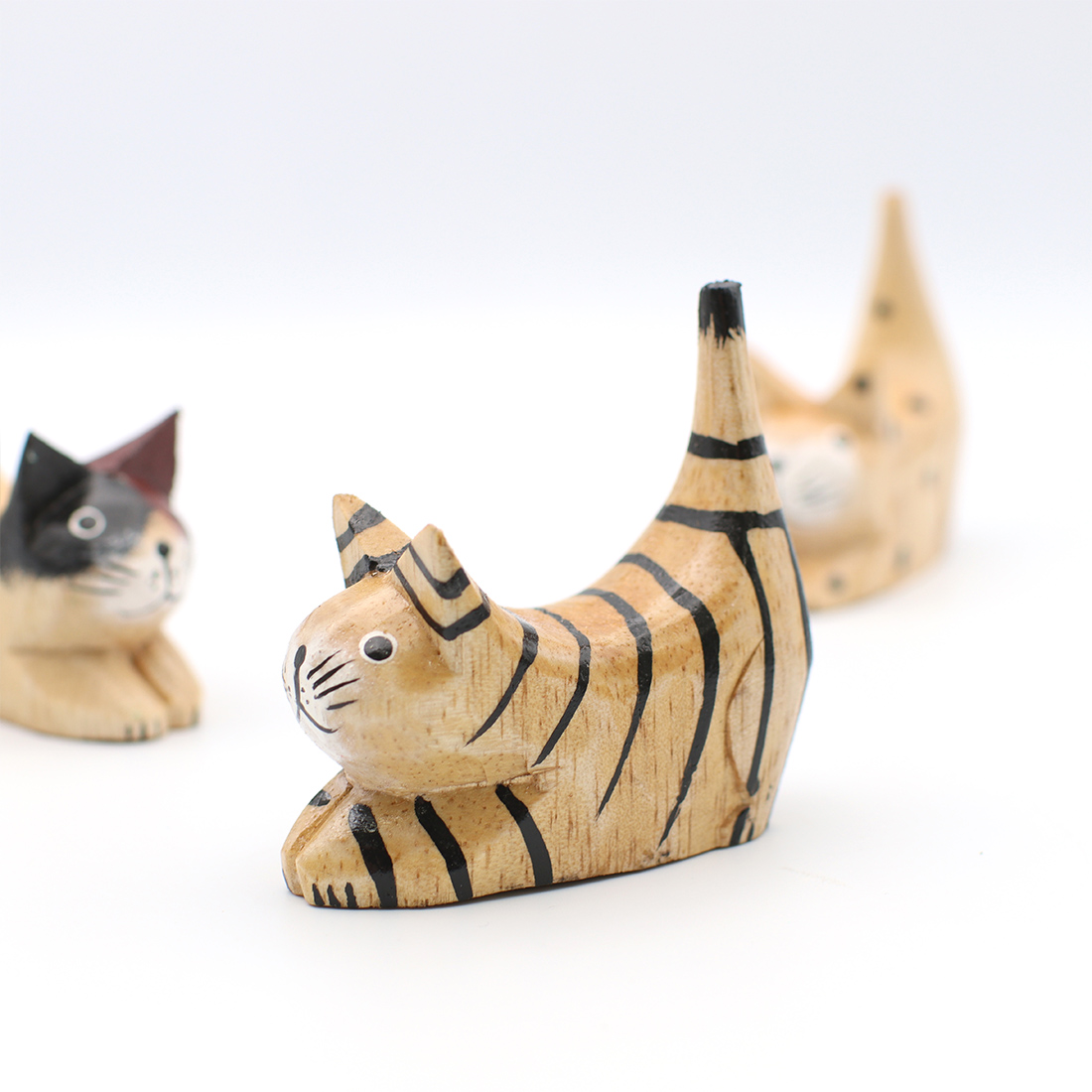 お尻を上げて獲物を狙っているかのようなポーズのネコの置物。デスクやシェルフにちょこんと飾って下さい。職人さんの手作りのため形や絵柄、色合いに多少のばらつきがある場合がございます。