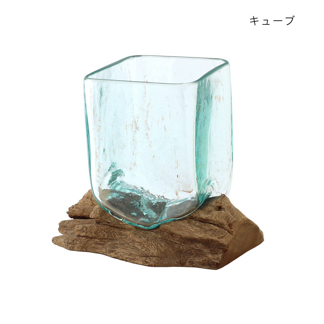 古木にガラスをふきつけて形成しているため、ガラスや木の形はひとつひとつ異なる、世界に一つだけの組み合わせです。
