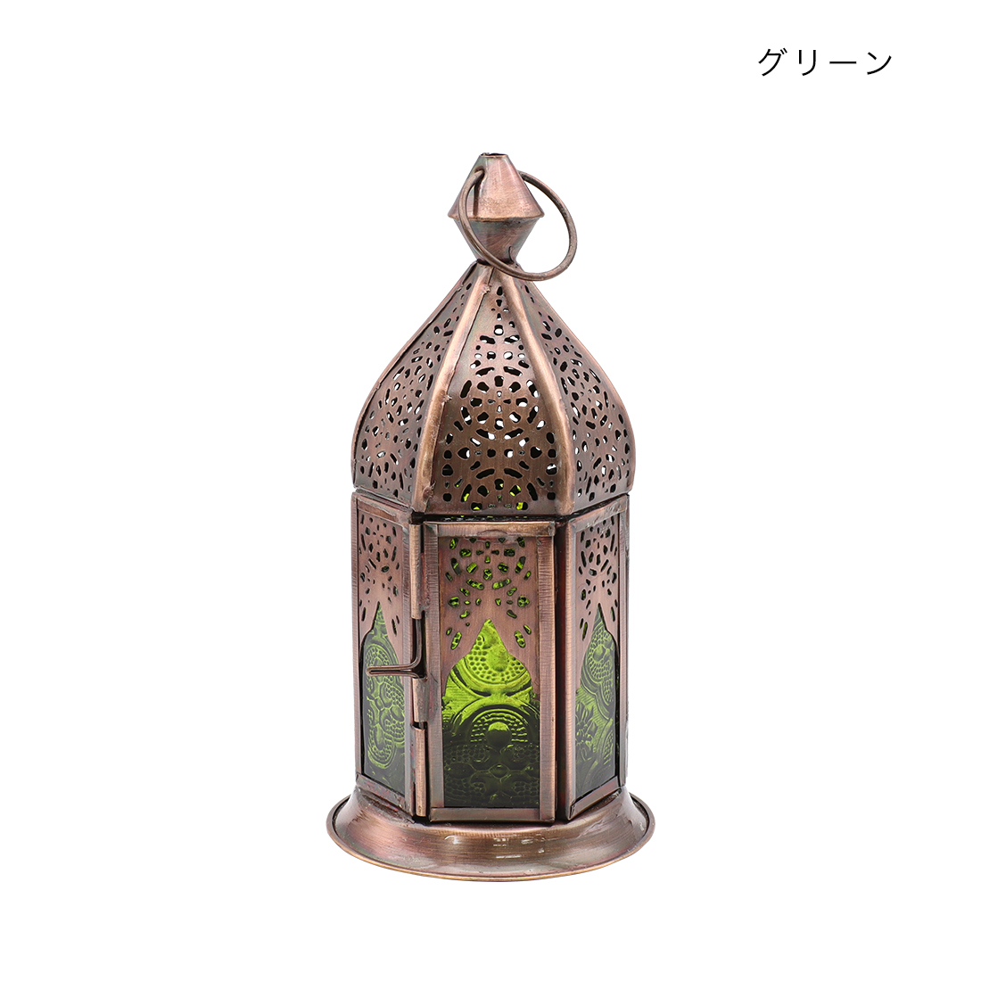 繊細な透かし柄と色鮮やかなレリーフガラスが美しいモロッカンキャンドルホルダー。