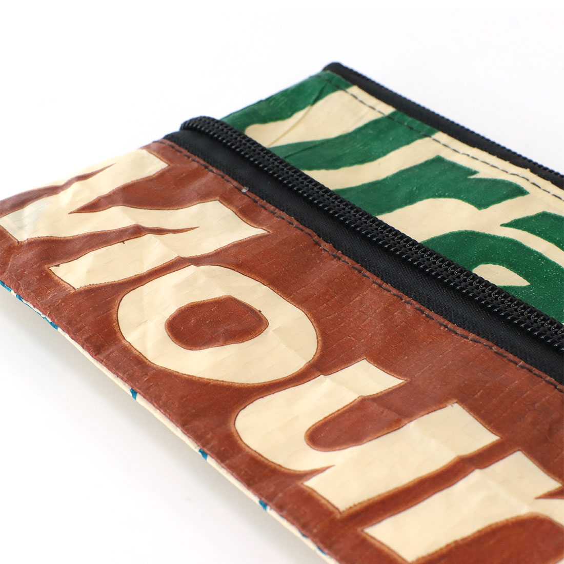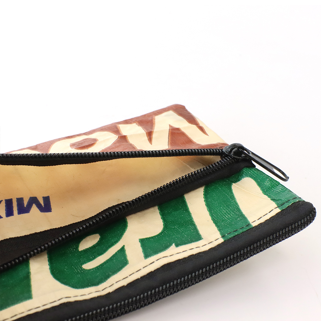 セメント袋を再利用したエコなポーチ。内側にも生地を貼っているので強度もUP。ファスナーポケット付で機能性のあるポーチです。アウトドア用の小物を整理するのにもおススメです♪