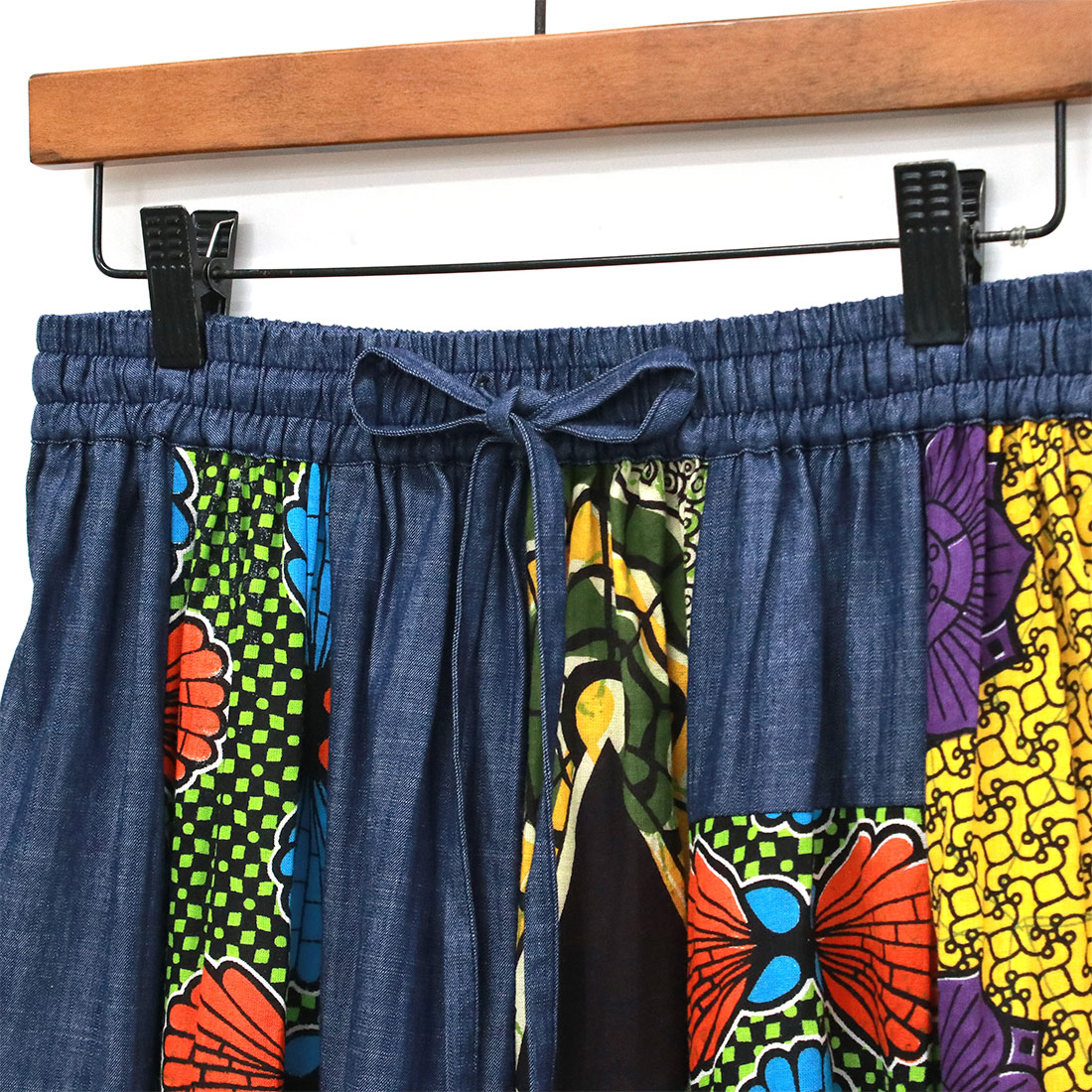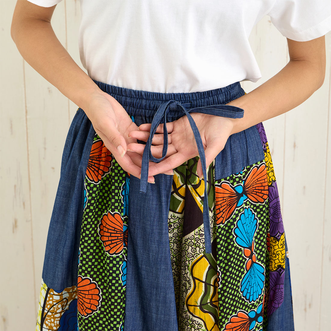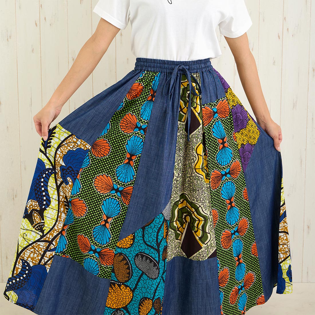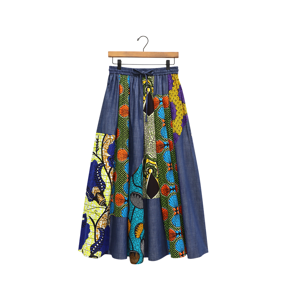 デニムとアフリカンプリントの組み合わせがおしゃれなロングスカートです。