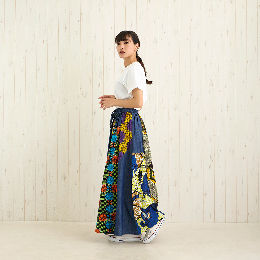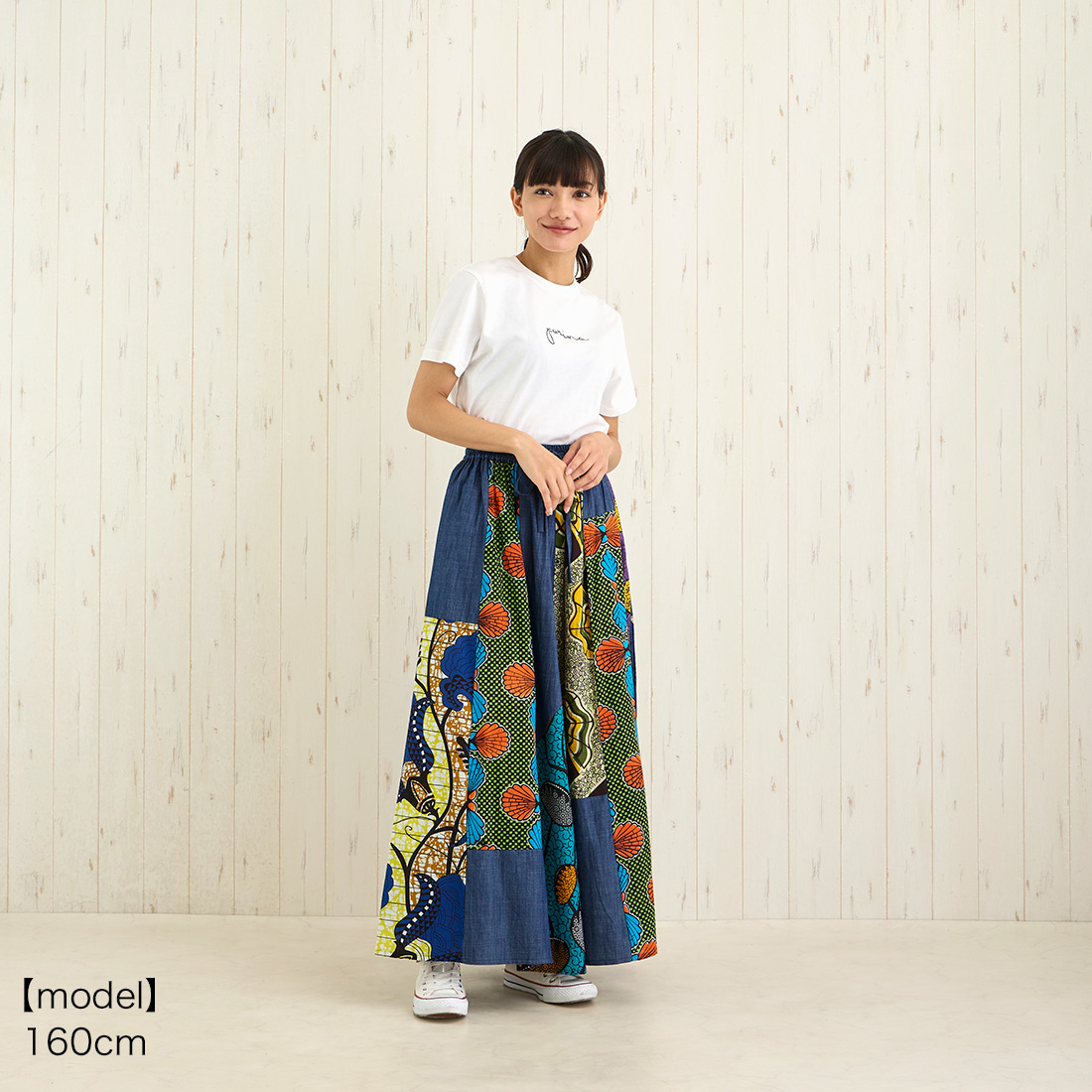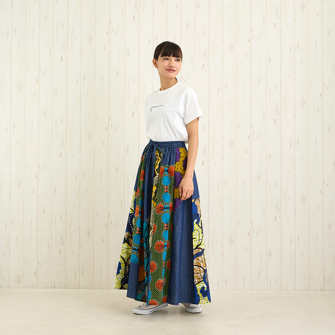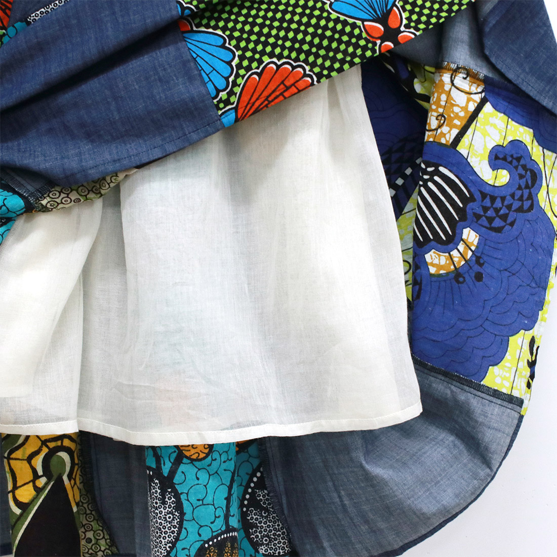 デニムとアフリカンプリントの組み合わせがおしゃれなロングスカートです。